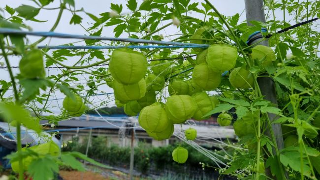 어느 집 울타리 철조망을 타고 올라간 풍선덩굴,