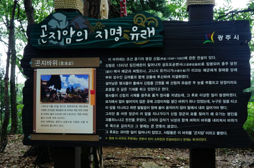 기대했던 사태봉에 관한 안내문은 없고, 곤지암의 지명 유래에 대한 안내문이 붙어 있습니다. 신립 장군 이야기와 함께 곤지암 바위에 전해 내려오는 전설도 안내문에 포함되어 있네요. 곤지암 역에서 2.8km 진행되어 온 지점입니다. 고도를 이정표에는 310m로 표시되어 있는데 gps상으로는 286m로 나오네요. 개인적으로 gps를 신뢰합니다.