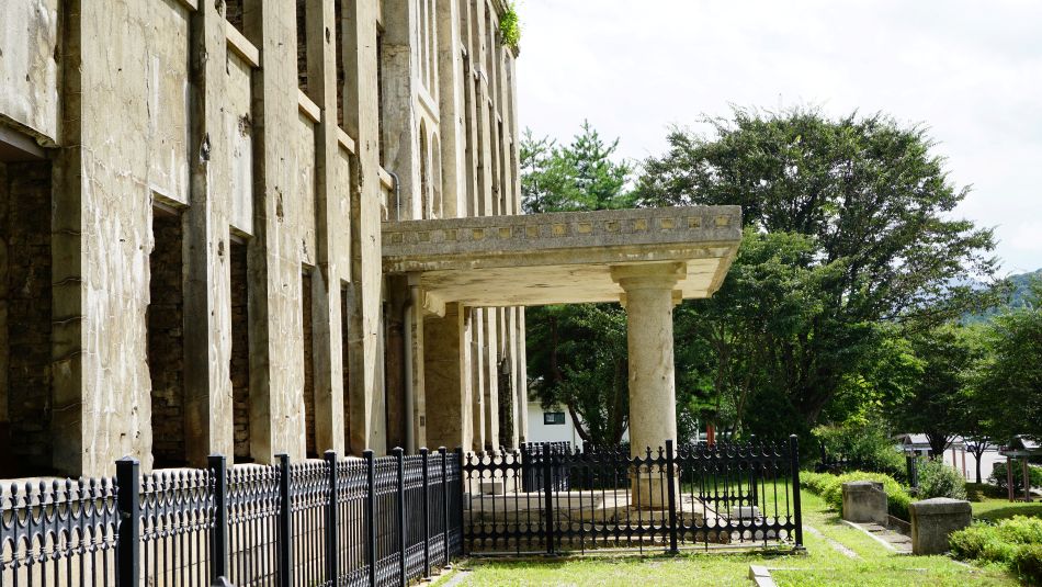 당사 우측 벽, 총탄자국이 무수히 박혀 있습니다.