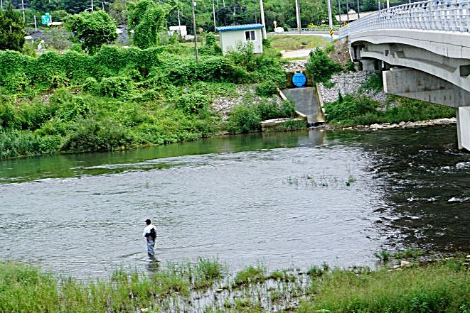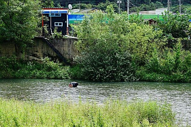 물에 들어가 수경 끼고 물속에 얼굴 묻고 다슬기 잡는 사람들 여전하네요, 그리고 여기저기 낚시꾼도 나와 앉아 있습니다.
