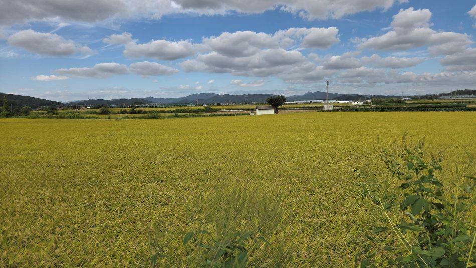 익어가는 율이리 황금들판에 어느 논에는 빨간 콤바인 한 대가 나와 벌써 탈곡작업을 하기도 하네요.