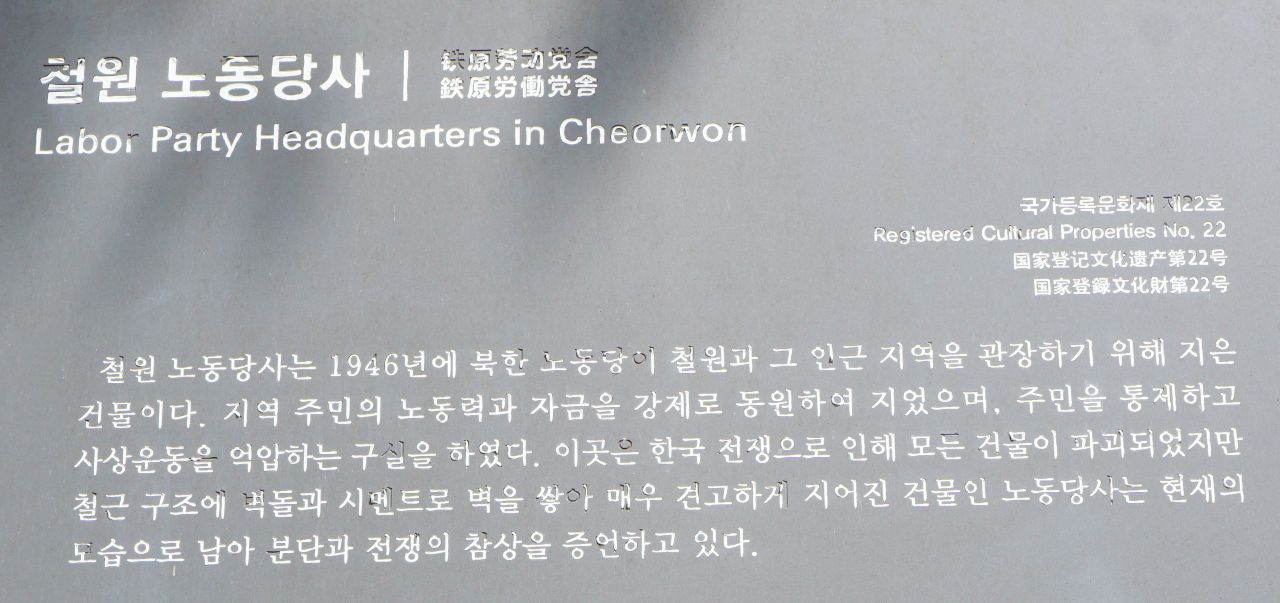 노동당사에 대한 설명문이 아쉽게도 너무 간단하네요. 건물의 몰골 구경하려 오는 곳이 아닐 터이므로 공산당의 착취, 수탈, 만행에 대한 역사적 근거와 팩트들을 추가해 널리 알려주었으면 좋겠는데요. 당시에 노동당사를 황급히 지으면서 1개 리당 200가마의 백미를 착취했다든지, 인력, 장비를 강제동원 하였고, 이곳에 반공인사들을 감금, 처형했고, 주변에서 인골, 인모, 고문용 로프도 발견되었다는 등 그들의 만행들이 인터넷에 검색되고 있는데, 사실이겠죠, 그런 팩트들을 모아 안내문에 추가했어야 했을 텐데, 간단히 설명하고 넘어가며 생략하고 있는 것 같아 아쉽습니다. 다음에 노동당사 건너편에 있는 철원역사 문화공원에 들러 노동당사에 대한 팩트들이 정리되어 있는지 살펴보도록 할 생각입니다.