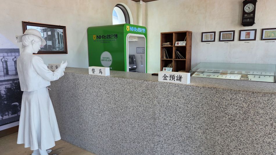 수납창구 옆에 옛 구식 선풍기와 벽 액자에는 저금통장, 배급통장,