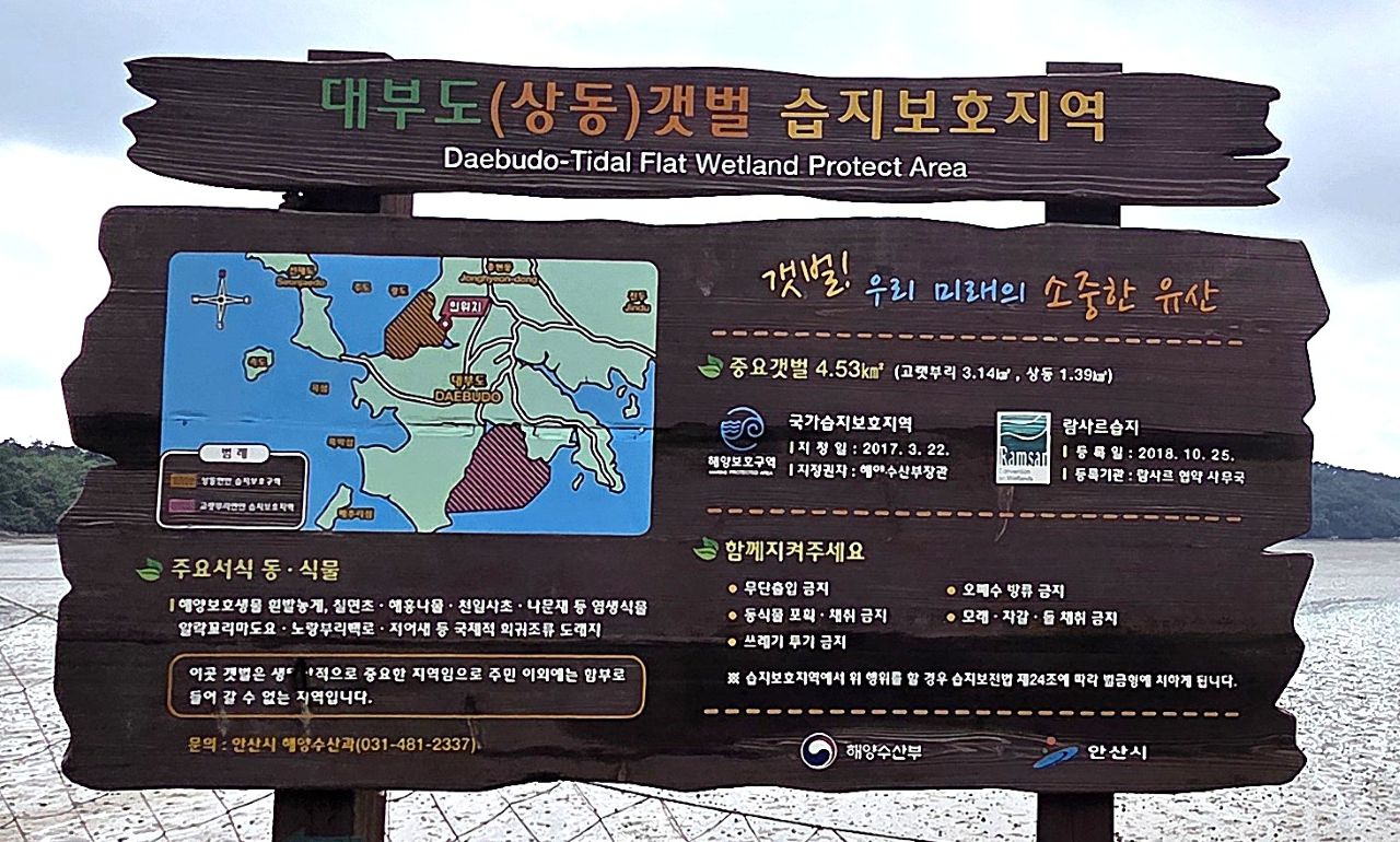 가다가 상동갯벌전망대로 내려가는 길을 따라 잠시 내려갔다 왔습니다. 2018년에 람사르협약국 사무국에 등록되었네요. 생태적으로 중요한 지역임으로 주민 이외에는 함부로 들어갈 수 없는 지역이라는 안내문입니다.