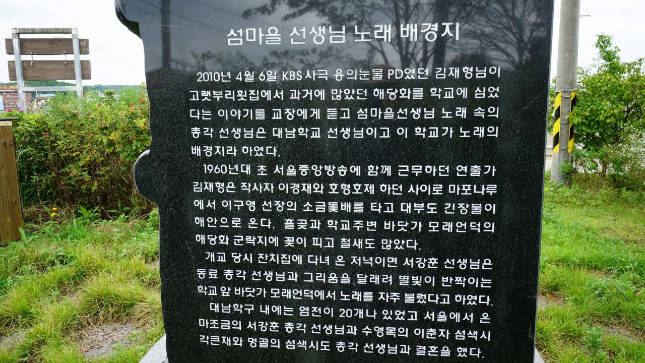 서울에서 온 마조금의 서강훈 총각선생님과 수영목의 섬색시 이춘자가 결혼하였고, 각큰재와 멍골의 섬색시도 총각선생님과 결혼하였다고 하는 섬마을 사랑이야기입니다. KBS 김재형 PD님이 이곳 대남학교가 그 노래의 배경이라고 밝혔는데 그는 작사자 이경재와 호형호제하던 사이였습니다.