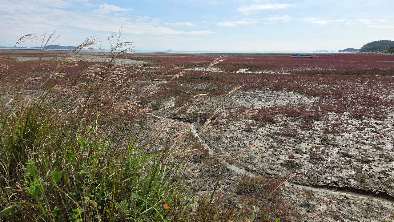 붉은 함초가 바다가 멀리 밀려난 드넓은 갯벌을 물들이고 있습니다. 그런데 이게 함초인지 칠면초인지 안내판이 없네요, 둘 모두 소금기가 많은 바닷가 갯벌에서 자라는 염생식물이고 비슷한 생김새에 잎과 줄기가 연두색에서 가을에 붉게 변하고 있어 구별이 쉽지 않은데요. 강화 석모도에는 안내판에 칠면초로 표시되어 있던데요. 개인적으로는 칠면초보다는 함초라는 이름이 더 어울린다고 보고 있는 편입니다.