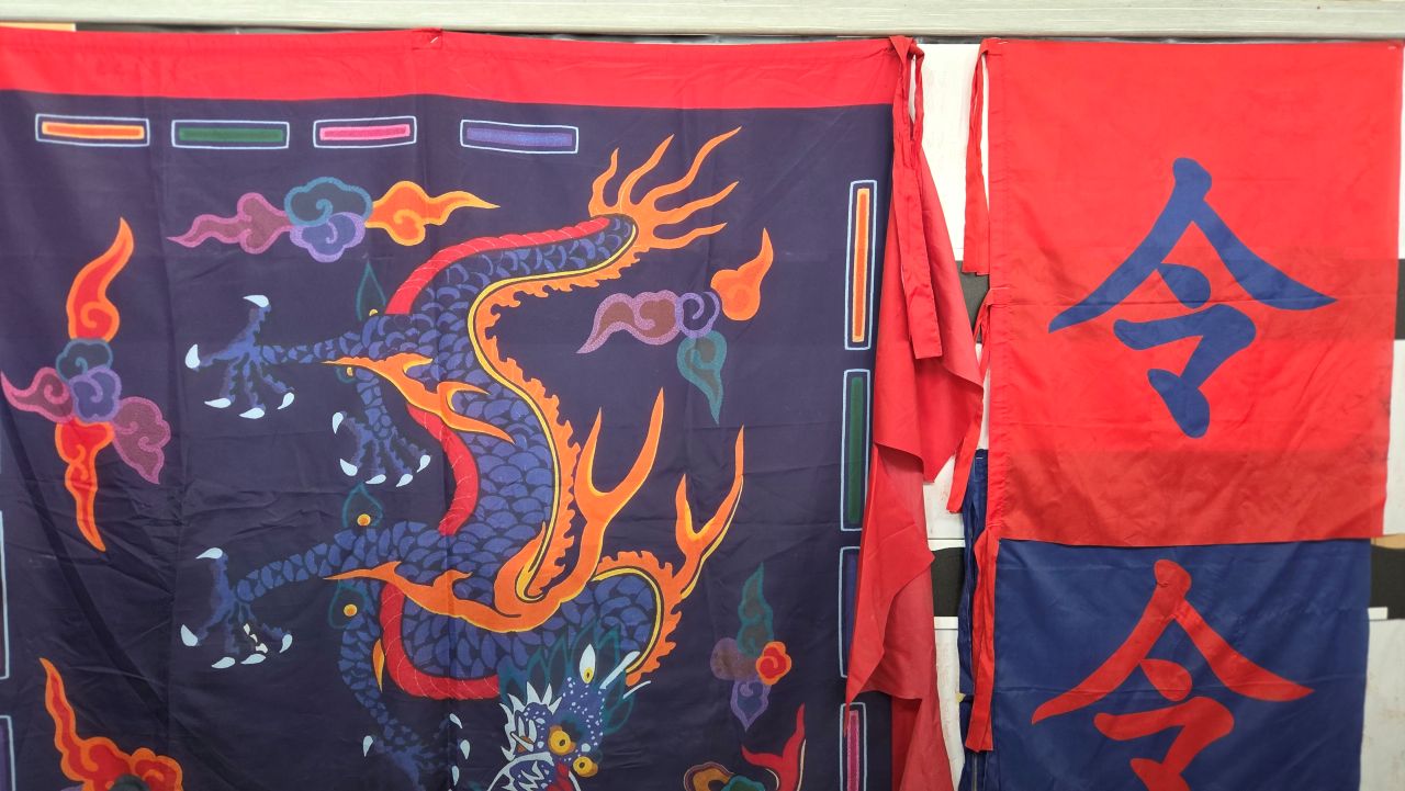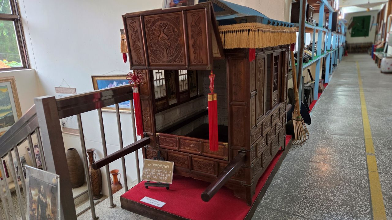 사극 관련 소품은 2층에 나뉘어 전시되어 있습니다. 사인교(부녀자용 가마), 사인교(사대부용), 왕비머리(가체 加髰), 만삭9개월, 편전세트, 영기, 도검, 창검, 화살주머니, 큰북, 육혈포, 육모방망이, 등입니다.