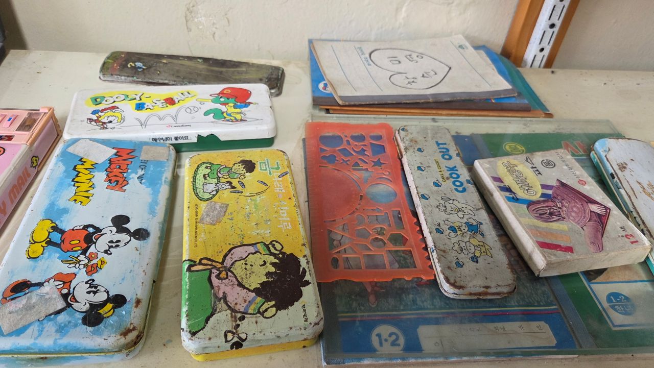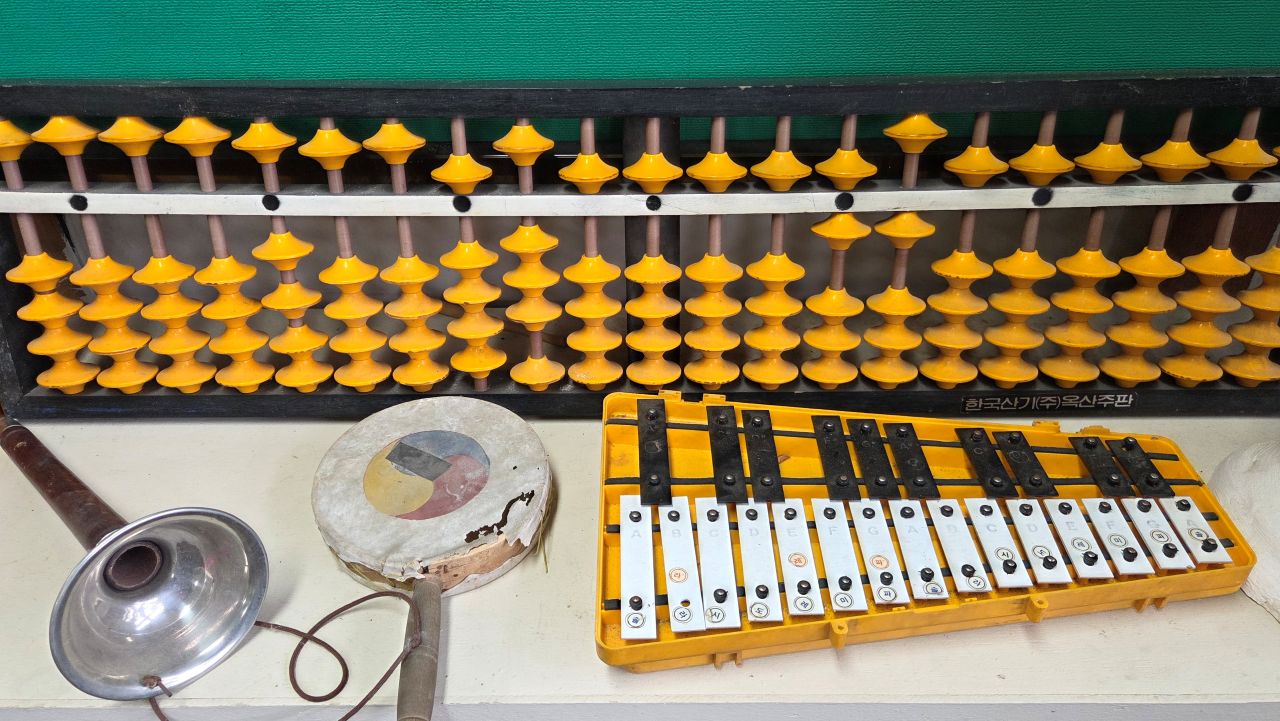 책보, 필통, 시간표, 등사기, 풍금, 실로폰, 주판알, 일부인, 주전자, 등등