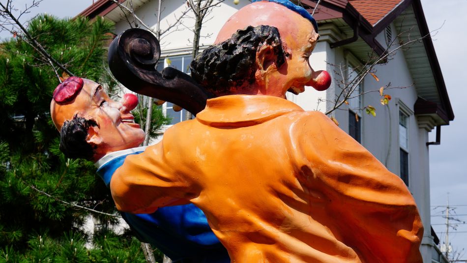 펜션시티 파리동, 몽마르트르 펜션 앞 잔디밭에, 세상에 이처럼 즐거운 표정을 보일 수가 있을까 싶을 만큼 신나는 거리의 광대악사 조각상 표정이 눈길을 끄는데요. 보기만 해도 즐거운 표정에 금방 전염될 것만 같은데요.