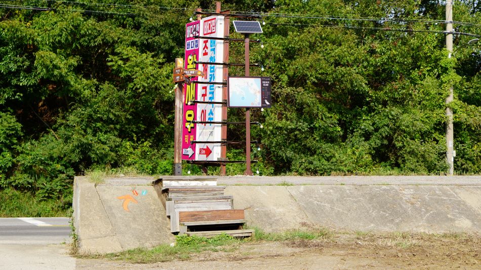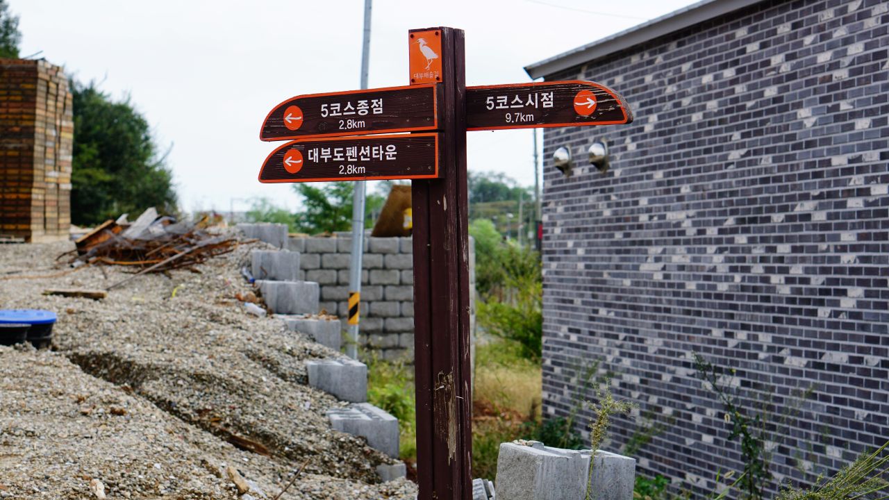 12:19분, 1킬로 정도 대남로 따라 걸어서 49코스 합류지점 이정표에 도착, 좌측으로 대부펜션시티 가는 방향으로 출발하였습니다. 그대로 직진하여 5킬로 정도 코스 따라가면 50코스 시발점(49코스 종점)입니다.