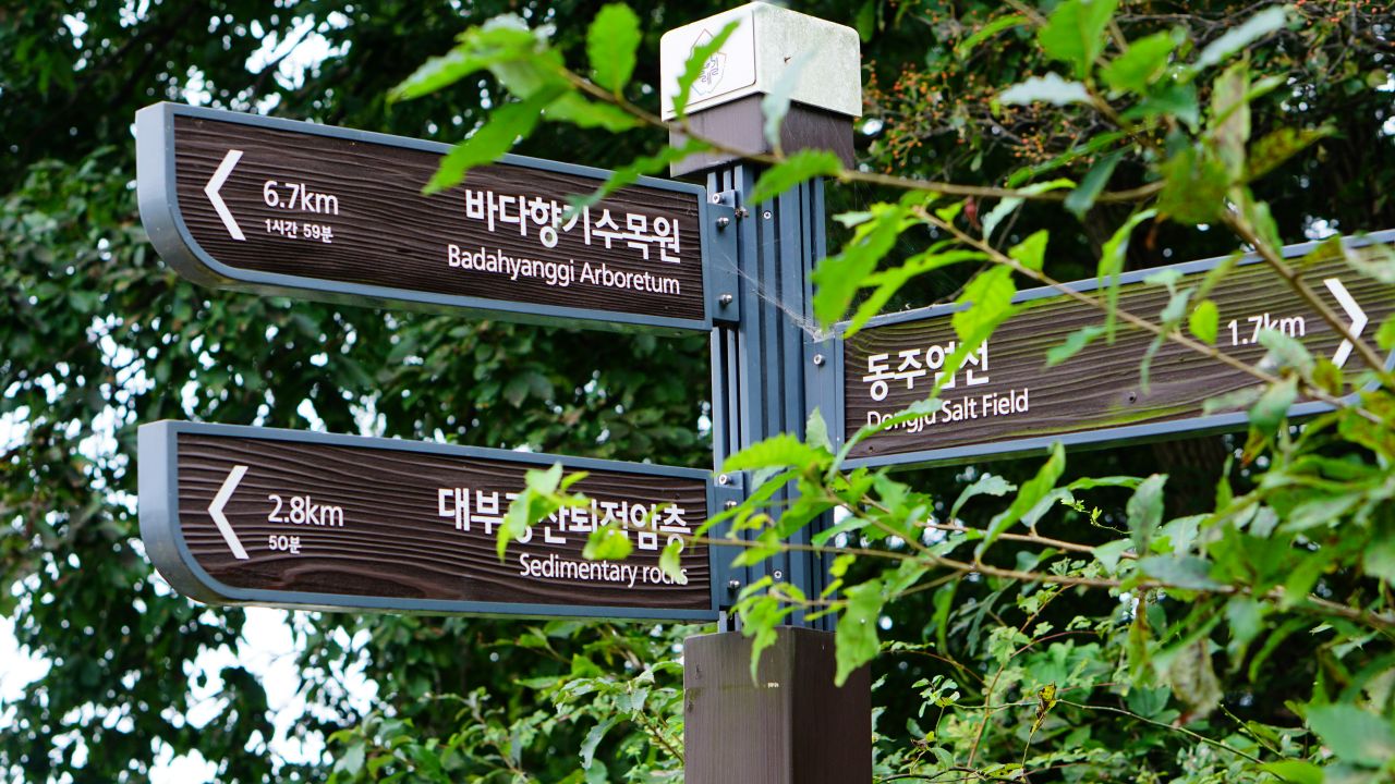 15:05분, 대선방조제 끝에 헷갈리는 이정표입니다. 바다향기수목원 2.1km, 대부광산퇴적암층 6km로 되어 있는데,