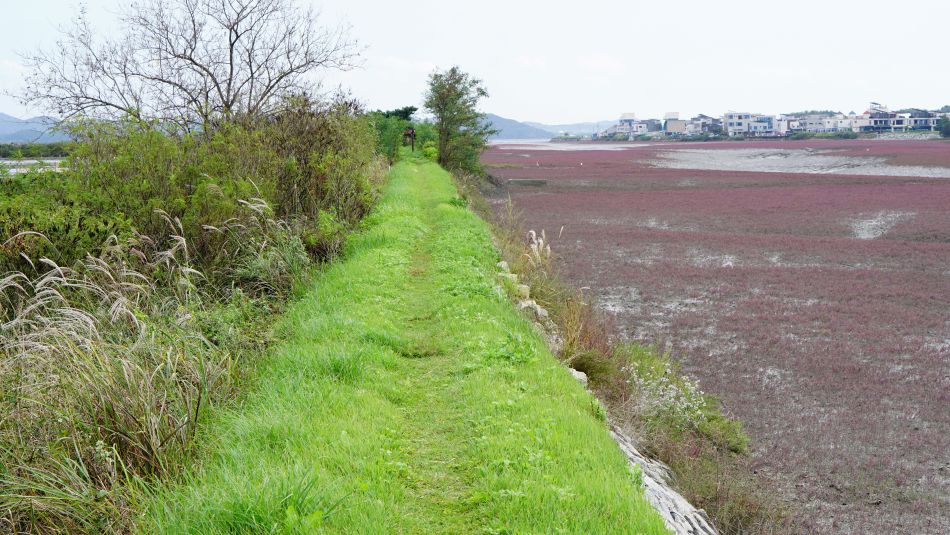 둑방길 따라갑니다. 왼쪽에 염전, 우측에는 함초밭,