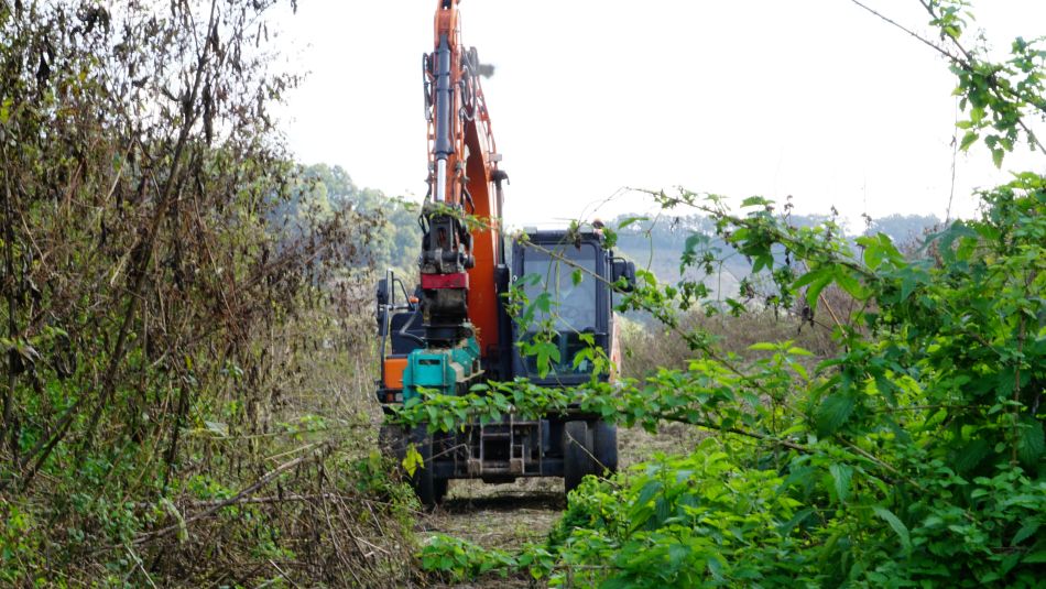 다음 경유지인 전망대를 가려면 산 위로 올라가야 할 텐데, 계속 농로 따라 평지길입니다. 포클레인 작업 중인 이 농로를 벗어나 오다가 어디선가 산길로 올라가야 했을 텐데, 뱀 무서워 풀숲길을 헤쳐 갈 수도 없고 이미 전망대 입구는 지나쳐온 것 같네요. 전망대에서 내려다 보일 것 같은 임진강이 궁금하지만 풀숲너머에 어딘지 보이지도 않고, 포기하고 그냥 지나갑니다.