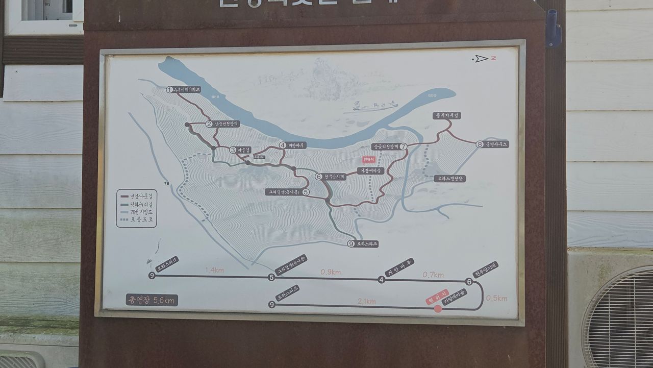 창고 옆에 세워진 코스 안내도를 살펴보니 현 위치 가람애마을입니다. 마을길에서 돌아 나와 포장된 농로 따라갑니다.