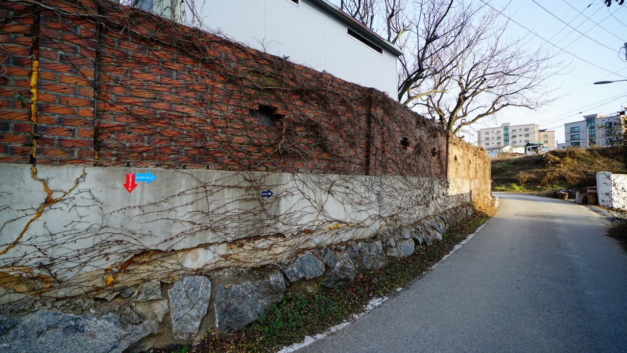 골목길에 진입, 벽돌담에 친절하게 붙여놓은 길안내 화살표,