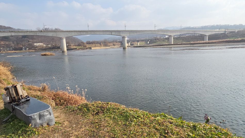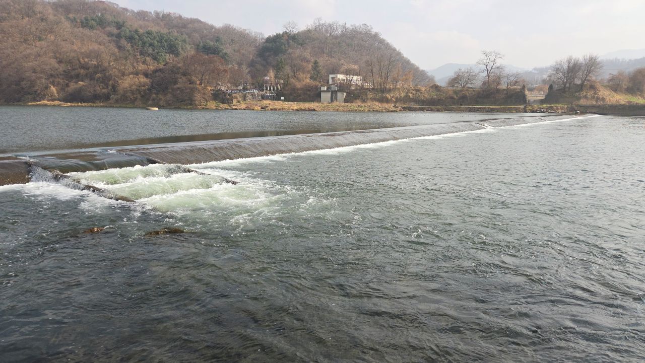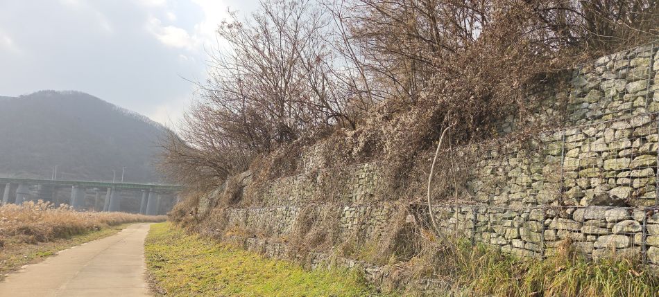 한탄강 연천구간에 조성되어 있는 5개 코스의 주상절리길 중 오늘 찾아 걸은 코스는 2코스입니다. 코스는 전곡근린공원에서 출발 전곡리유적지까지이지만 연이어지는 1코스에서 은대리성을 빗겨 지나치고 있어서 오늘 시간적 여유가 있는 만큼 은대리성까지 연장해서 다녀왔습니다. 전곡역에서 출발해 다시 전곡역으로 돌아오는 순환코스가 되었네요. 코스명칭은 '선사유적길'로 되어 있지만 유적지방문자센터로까지만 연결되고 있어 개인적으로 공감이 잘 안 되는데요, 그래서 '강변산책길'로 바꾸어보았습니다. 일부 유실되고 붕괴도 된 듯 보이는데 무성한 넝쿨잡초에 묻힌 데다 낙석방지 철망철책선에 가려져 잘 보이지도 않는 주상절리를 찾아 절벽바위들을 살펴보며 물소리 가까이 강변산책길을 따라 걸었습니다. 아침에 물안개가 강변에 피어올랐나 보네요, 강물 위에 번져 남아있는 엷은 물안개가 한낮의 햇빛에 뿌옇게 반사되고 있었습니다.