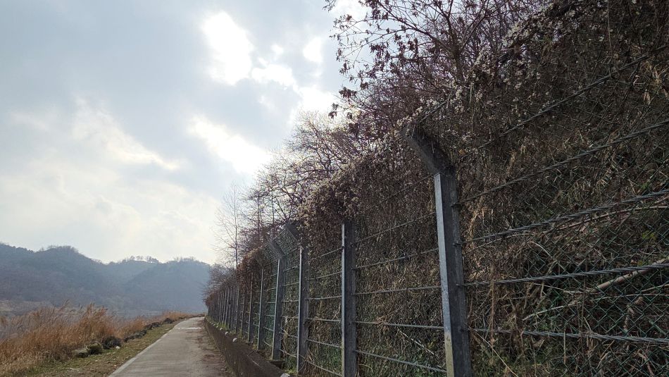 계속 이어지는 높고 견고한 철망철책, 그 너머로 보이는 절벽바위들, 유실되고 부서진 듯 보이기도 합니다.