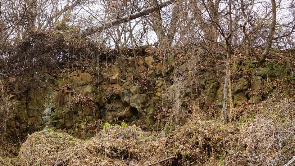 살펴보면 철망철책 너머로 겨우 보이는 절벽 바위들, 그마저도 넝쿨잡초에 덮여 가려져 있지만 틀림없는 주상절리죠.