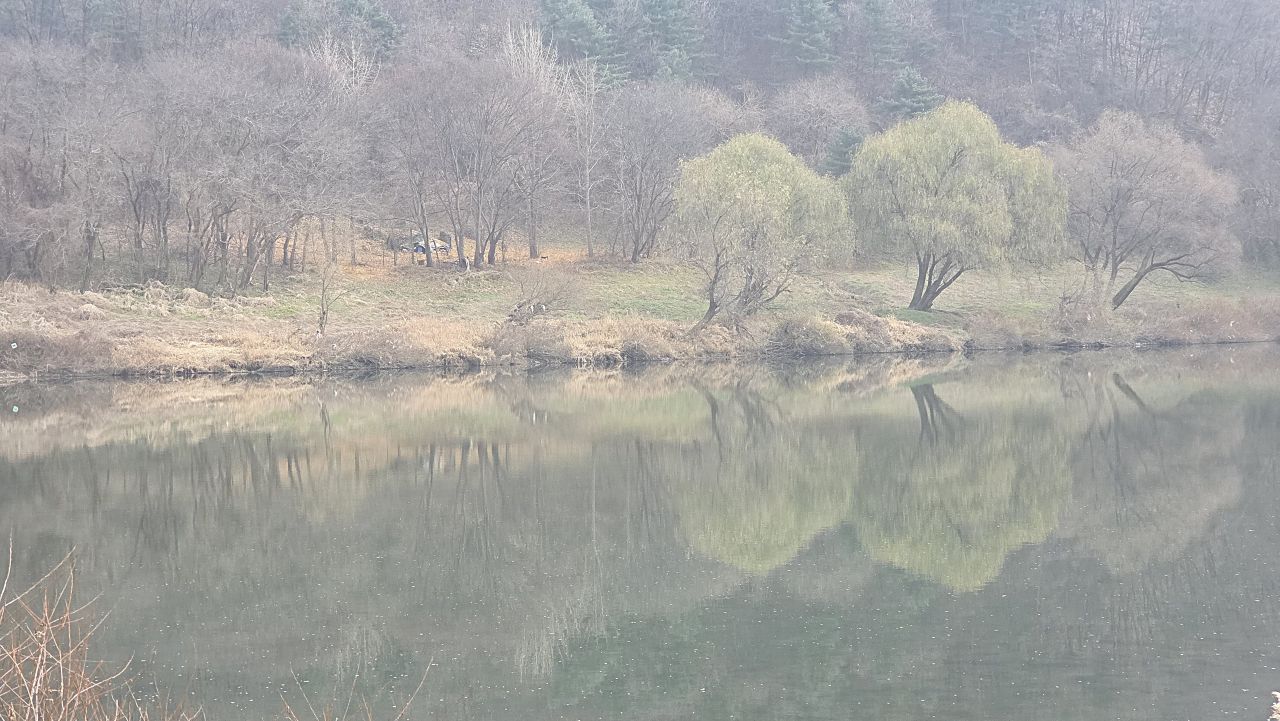 오늘 아침에 물안개가 피어올랐네요. 아직 엷게 물가에 남아 안개처럼 번져 있습니다.