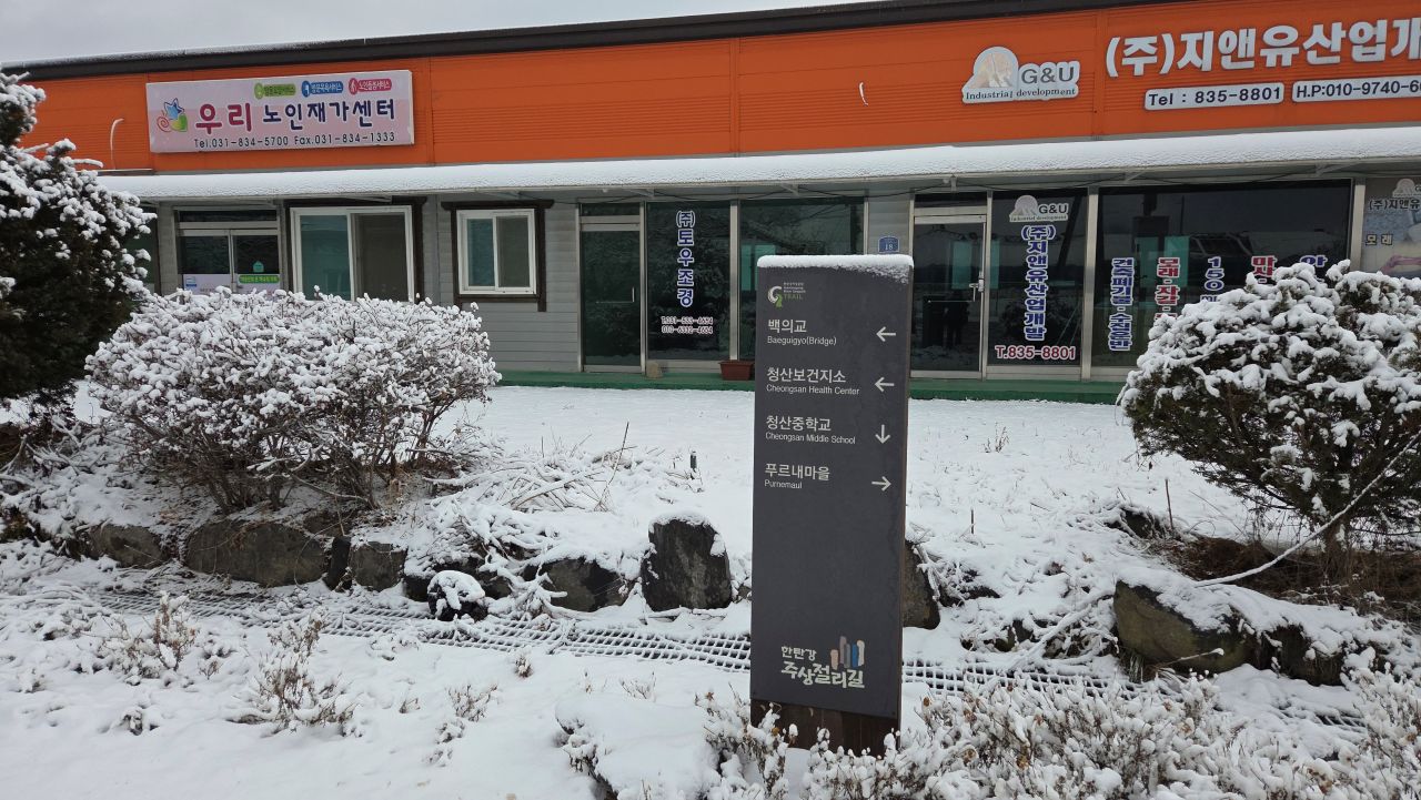 | 도보여행: 한탄강주상절리길 5코스<<베개용암 출렁다리 - 궁신교 - 궁평리마을길 청연로(블랑제리 빵공장 - 청산면주민자치센터 - 청산중학교) - 아우라지길 - 영평천 백궁길( 이정표 - 반사경 - 고갯마루 - 인삼밭 - 도깨비목장 - 댕댕이전망대 - 반딧불이캠핑장 갈림길 - 저수지 - 고갯마루 쉼터 - 숭조원 - 백의교) - 백의마을 방문자센터(종료)>> 합 7.3km, 하이라이트: 영평천 따라 백궁길 전코스 눈덮인 설경 교통편: 34번 버스(전곡역 ~ 아우라지 베개용암), 56번 버스(백의리 ~ 전곡역) |