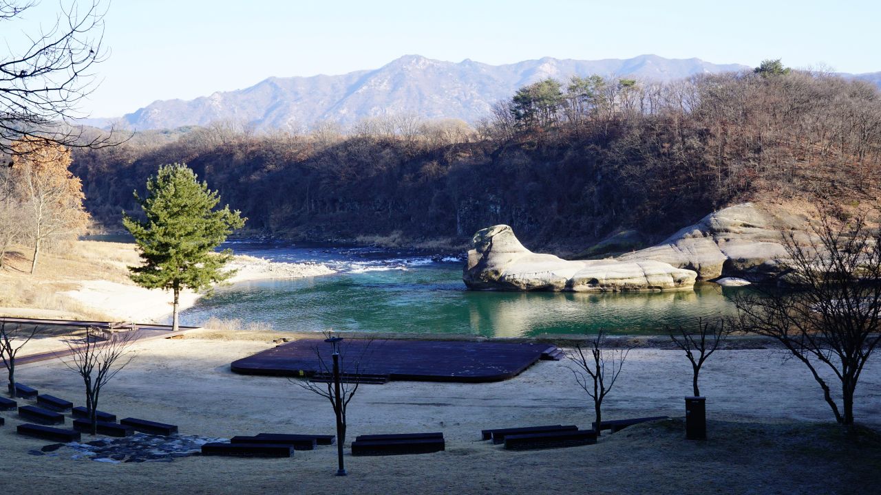 화적연(禾積淵), 볏짚을 쌓은 노적가리 모양이라는데.. 개인적으로는 언뜻 바다표범, 물범이 생각나는데요. 이곳은 군 휴양소라서 간이무대와 관람석이 빙 둘러 설치되어 있습니다.