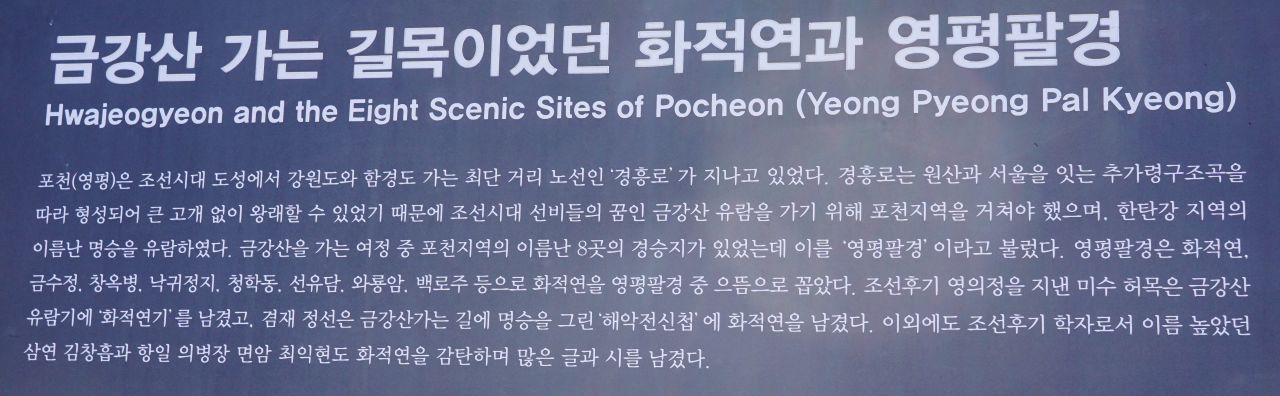 영평은 포천의 옛 지명, 포천지역의 8곳 경승지를 영평 8 경이라 했는데, 그중 화적연을 으뜸으로 꼽았다는 설명입니다.
