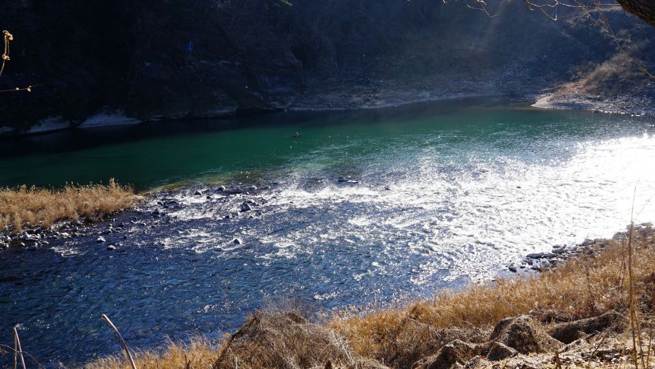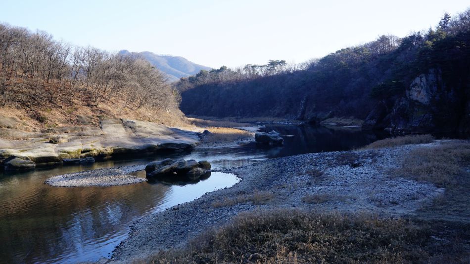 유유히 흐르는 한탄강, 강물에 잔물결이 고와 보이네요. 강물 가까이 내려와 나뭇가지들에 가려지지 않은 풍경이 이어집니다.