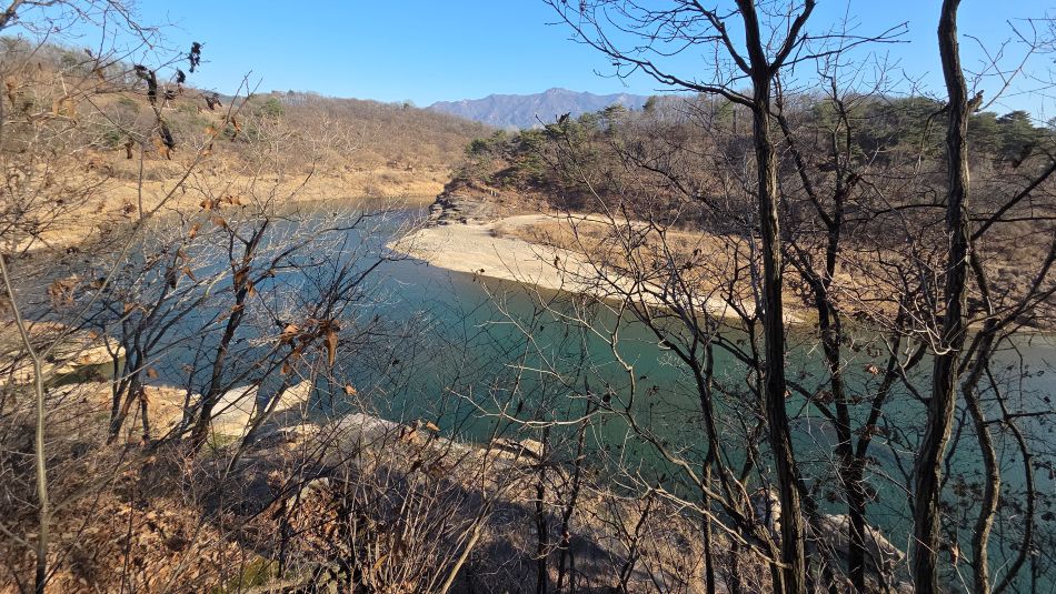 나뭇가지 사이로 내려다 보이는 화적연, 500여 미터 전방입니다.
