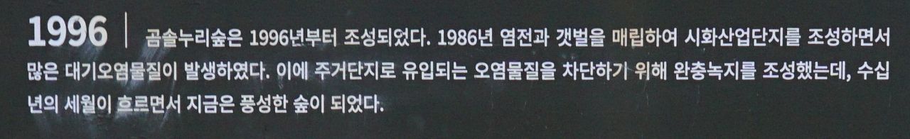 '곰솔누리숲'은 시화산업단지에서 날아오는 대기오염 물질이 주거단지로 유입되는 것을 차단하기 위해 조성된 인공 차단녹지입니다. '곰솔'은 바닷가 소나무인 해송의 순우리말로서 차단녹지가 이제는 숲을 이루어 차단역할만이 아니라 야생동물들의 서식처와 시민들의 산책과 치유를 위한 숲으로 변모하였다는 설명입니다.