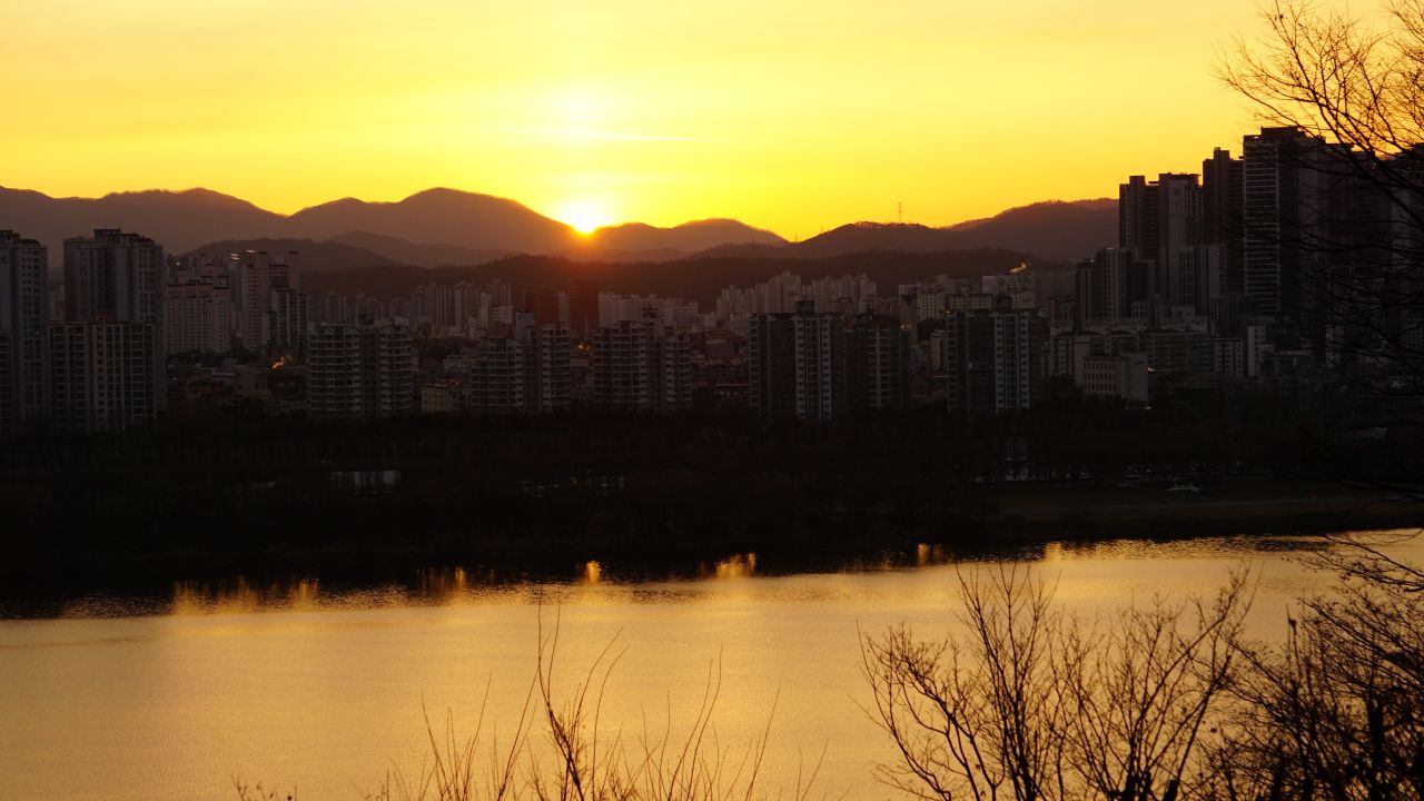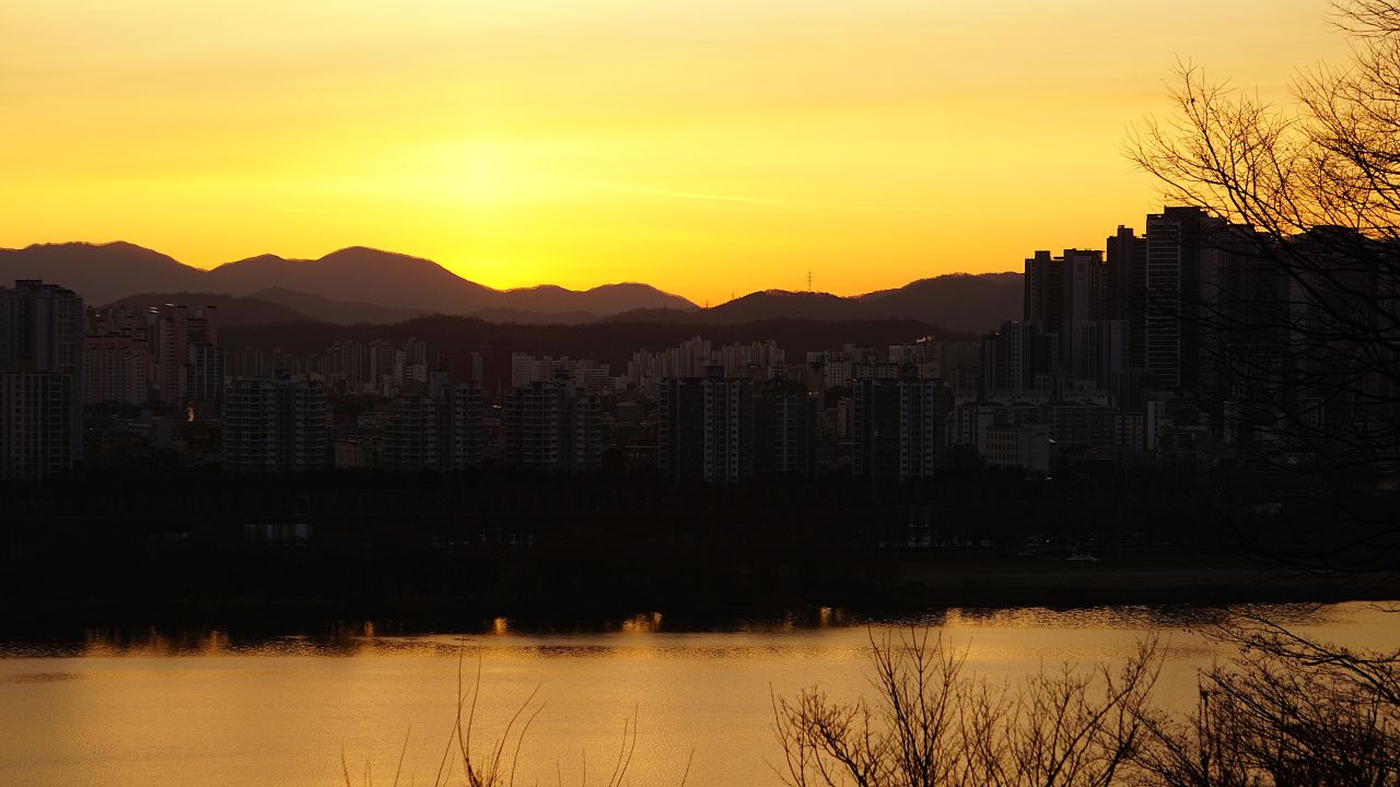 07:46분, 한강변 광나루에 많은 사람들이 나왔네요. 검단산, 남한산성, 남한산으로 이어지는 능선 위로 여명이 붉게 물들고 있습니다.