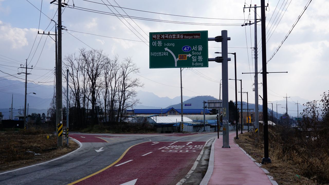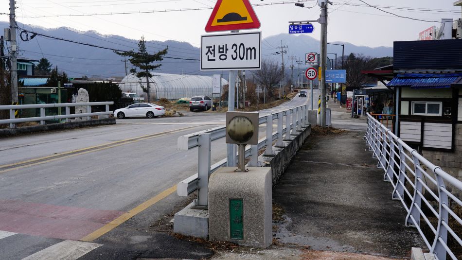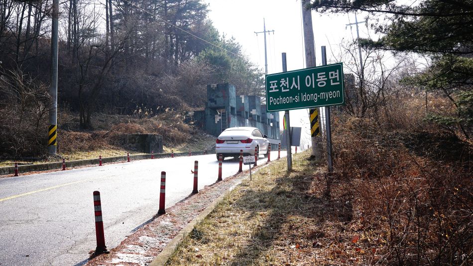 12:35분, 낭유고개, 대전차 장애물이 설치되어 있는 고갯마루, 넘어가면 이동면입니다. 낭유고개에 대한 안내문이 있겠지 싶었는데 없습니다. 종점까지 9km 남았네요, 3.3km 진행된 지점, 업힐다운힐 명소인 오늘의 코스에 바람과 추운 날씨 탓인가 자전거들이 하나도 안 보이네요.