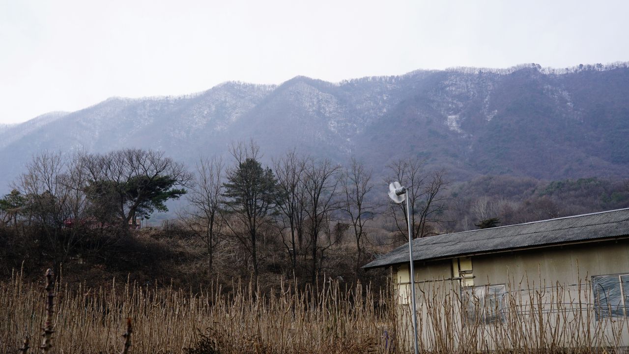 간간이 흩날리던 눈발이 눈에 띄게 흩뿌려지며 강풍이 몰아치고 있습니다. 바람개비가 고속으로 돌아가고 있죠. 뒤에 우뚝한 산은 관음산,