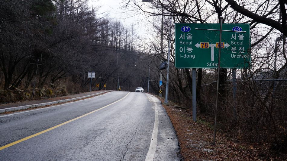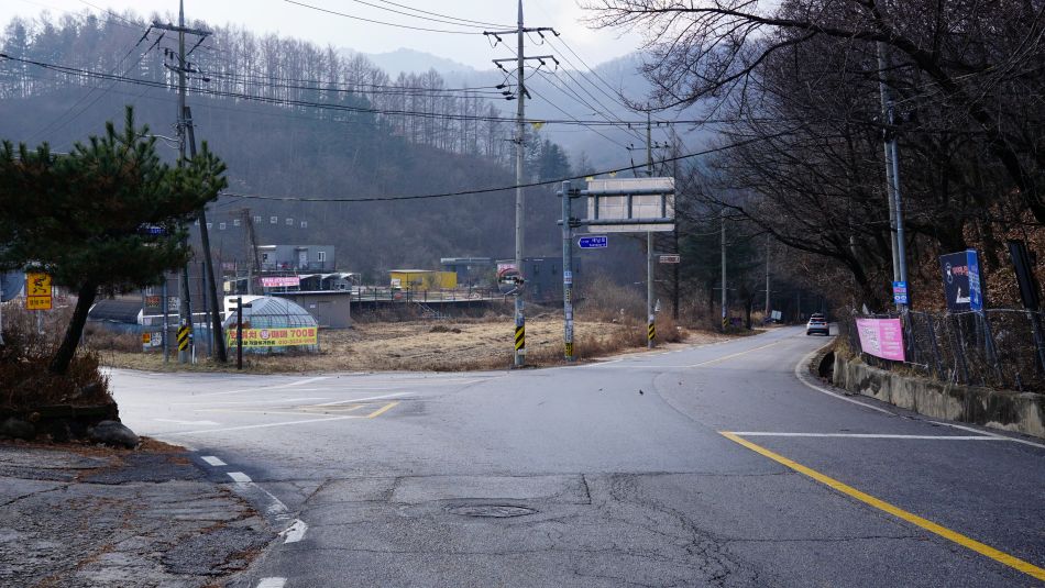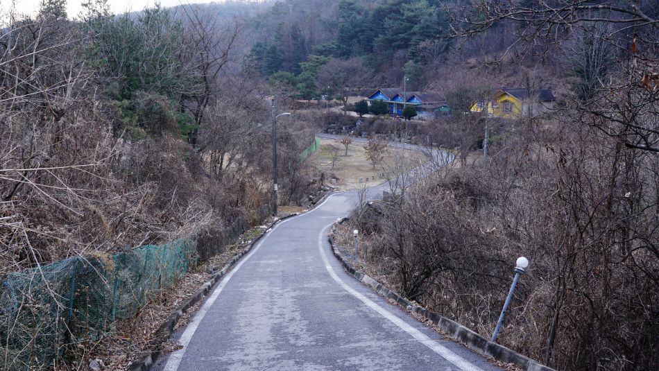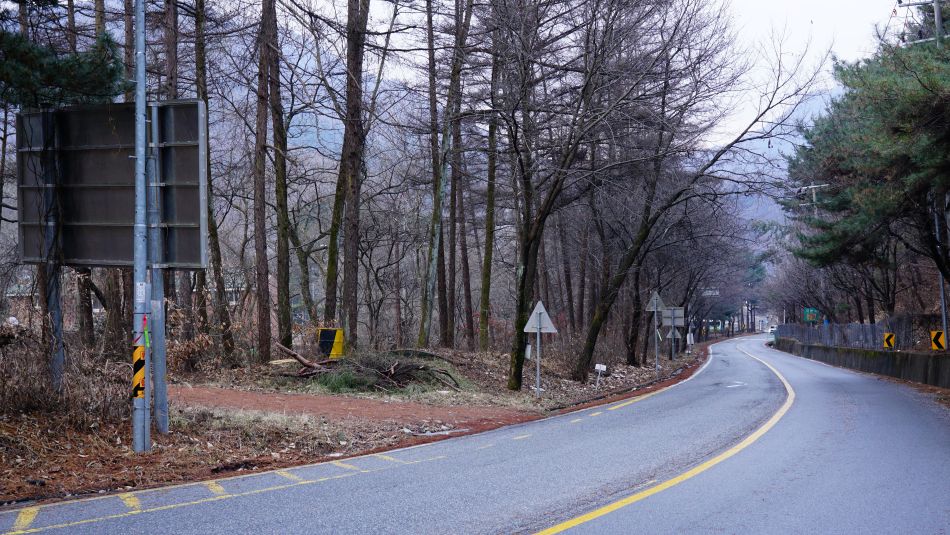 올라온 오르막보다 더 가팔라 보이는 내리막길, 결빙되어 있었다면 극조심구간이죠.
