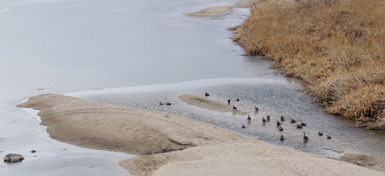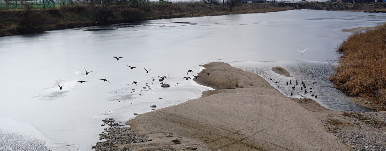 대교 밑으로 흐르는 영평천, 괜히 놀라 날아오르는 오리들,