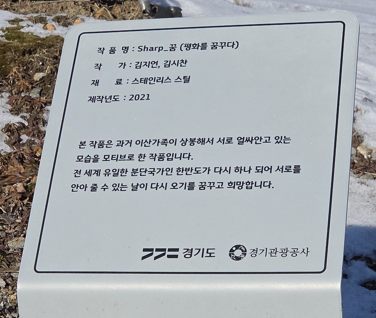 끊어진 철교 교각 앞에 설치된 조형물은 이산가족이 상봉해서 얼싸안고 있는 모습을 모티브로 한 작품입니다.