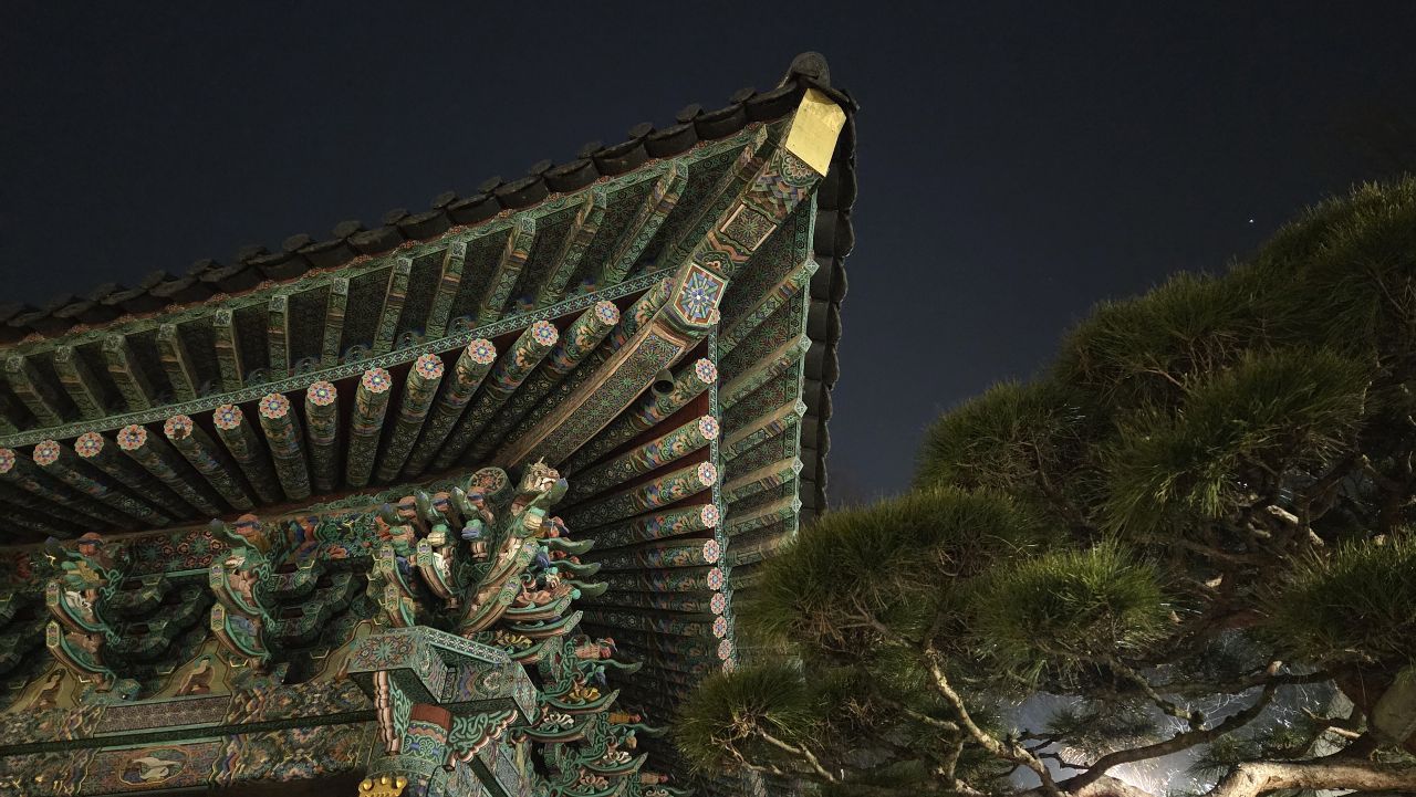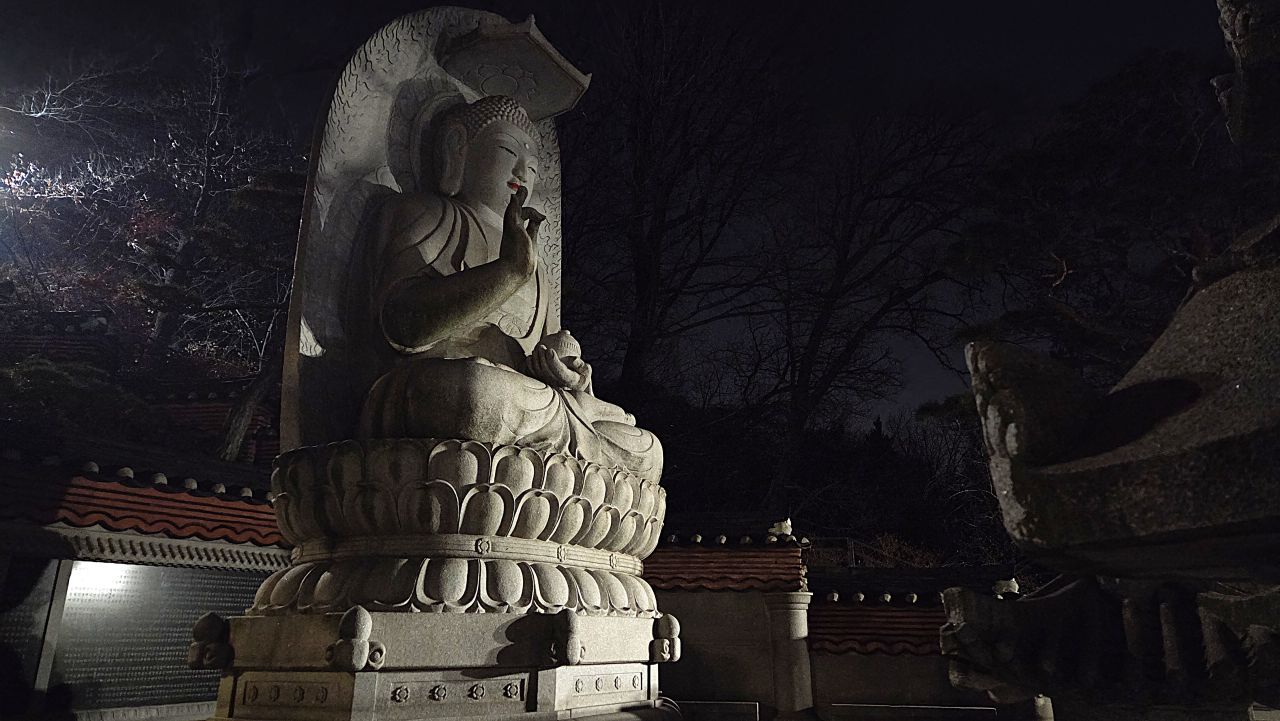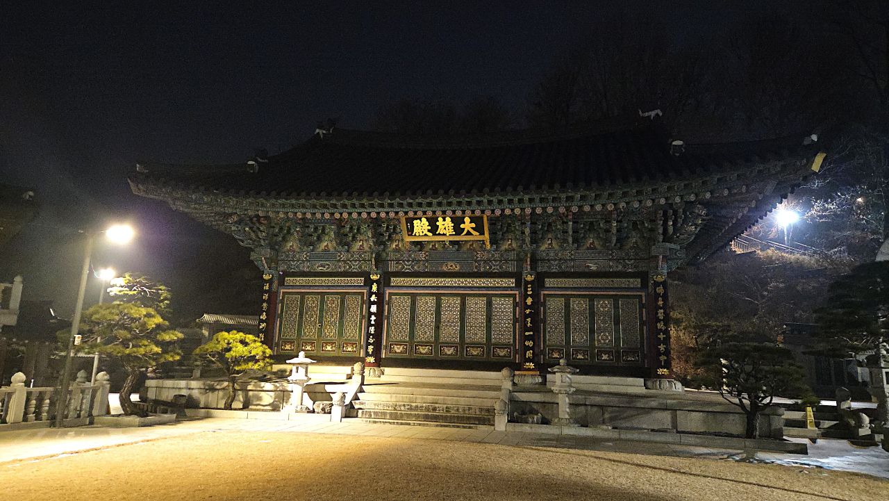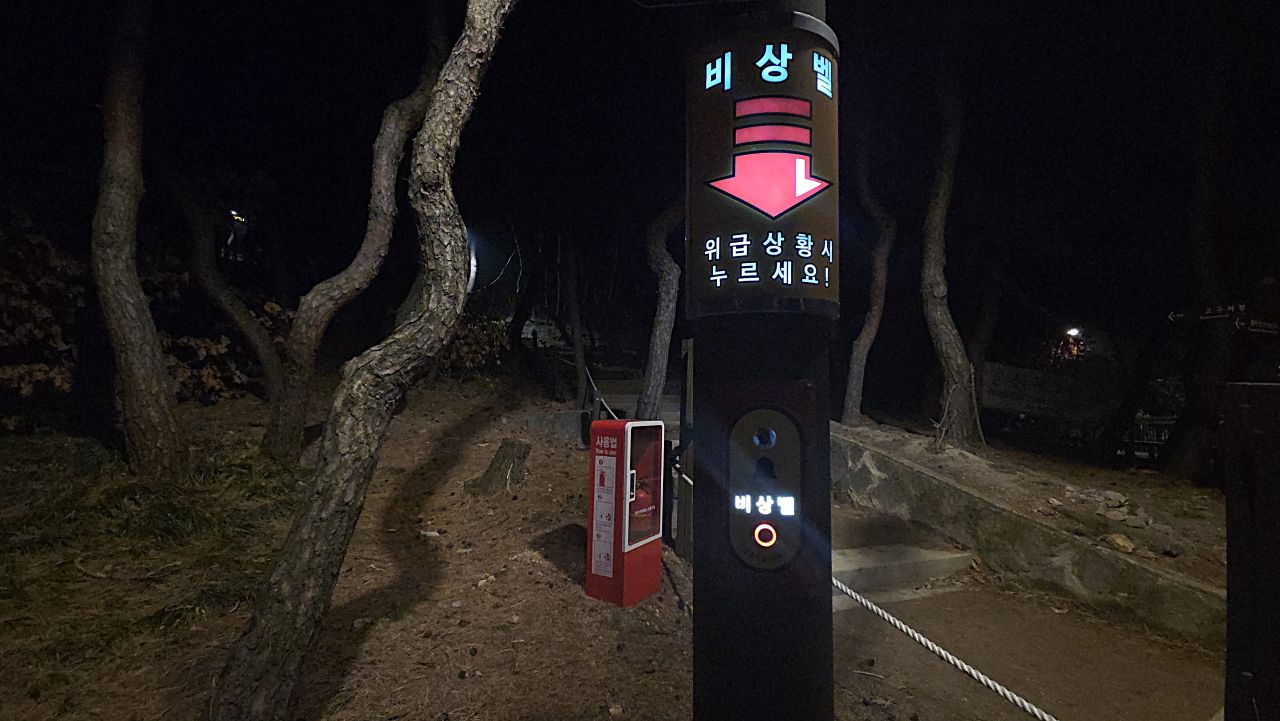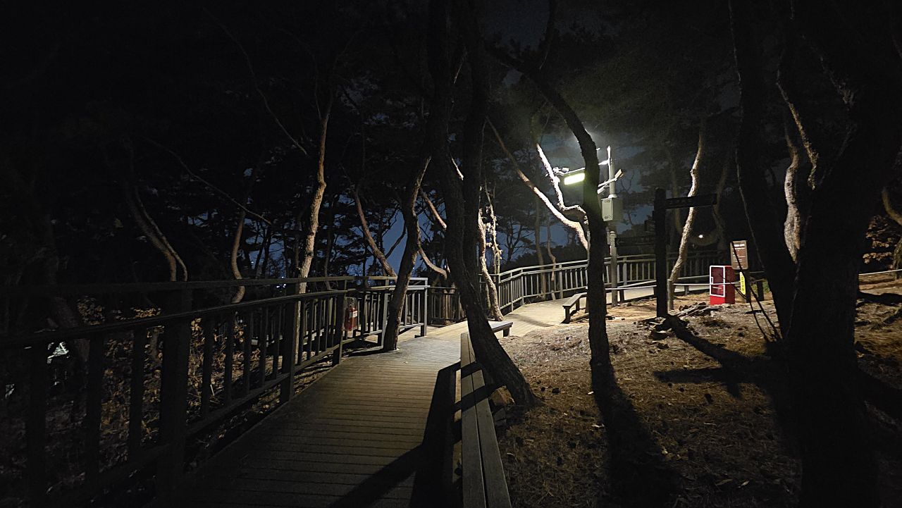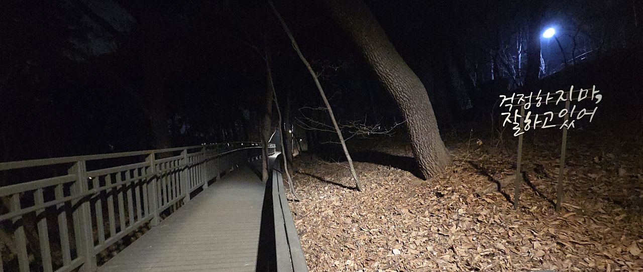 장신대 북문 앞에서 아차산동행숲길에 진입, 무장애 데크길 따라갑니다. 동행숲길 끝나면서 평강교 건너가 이어지는 데크길 따라가다 영화사갈림길 지나 계속 이어지는 데크길, 긴고랑으로 내려가는 갈림길에서 기원정사로 내려가면 대웅전 앞에 커다란 둥근 소나무가 어두운 밤하늘을 이고 있습니다. 가원정사의 명품소나무, 반송입니다. 오늘 저녁 산책코스는 반송을 둘러보고 다시 돌아오는 순환코스입니다. 영화사 갈림길까지는 완벽한 무장애데크길이 이어지지만 이후 기원정사로 가는 도중에 짧은 내리막계단이 한 군데 연결되어 있어 휠체어나 유모차 등은 더 이상 건너갈 수 없다는 게 아쉽죠.