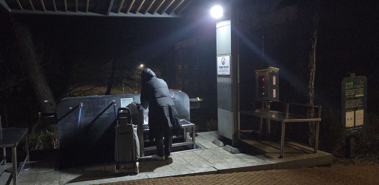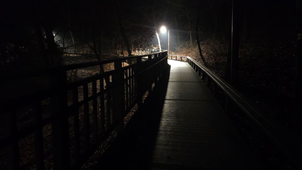 어둠이 내려앉은 워커힐길, 추위가 풀리면서 엷은 밤안개가 피어올라 어둠 속 가로등 불빛이 희미하게 젖어들었습니다.