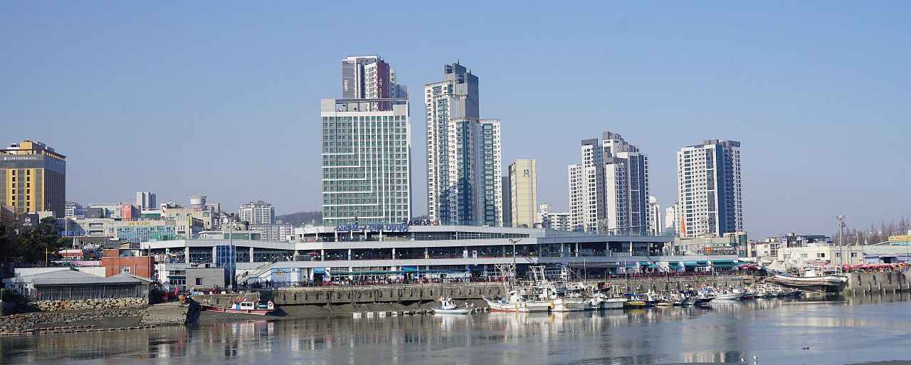 이어지는 벚나무 가로수길 우측에 소래포구, 북적이는 소래어시장,
