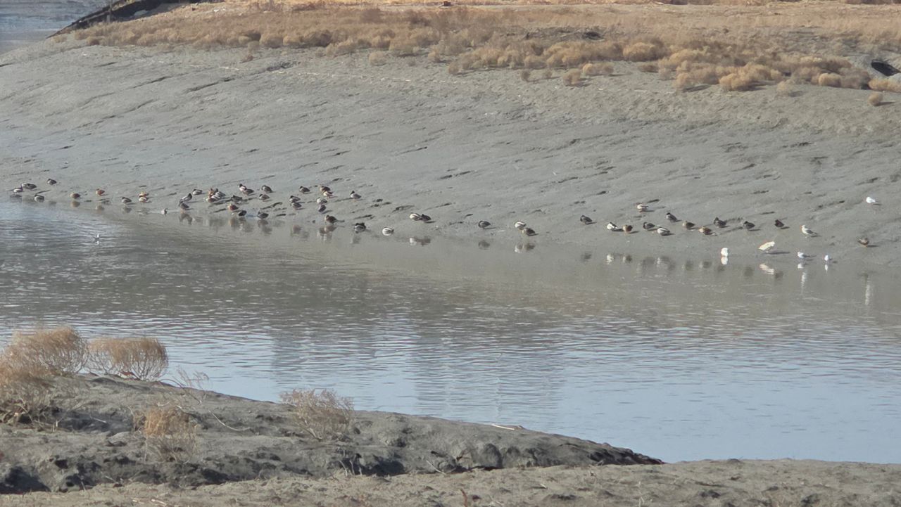 양지바른 갯벌흙에 모여 있는 오리와 백로들