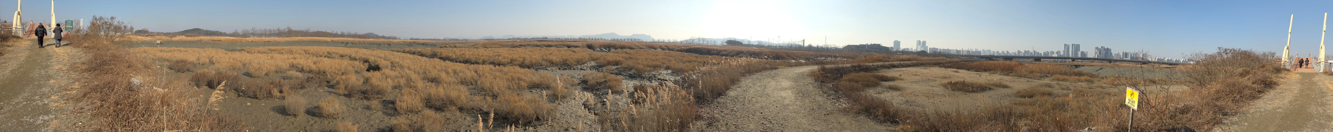 갯골에 랜드마크인 자전거다리를 건너가면서 펼쳐지는 드넓은 들판, 360도 파노라마로도 담았습니다. 시커먼 갯벌흙, 축축해 보이는데 머드축제를 해도 될 만큼 고와 보입니다. 오리들도 양지바른 갯벌에 옹기종기 모여 있네요.