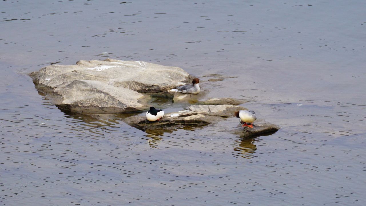 팔당댐에 아까 보았던 흩어져 있는 100여 마리 고니는 그대로인 듯한데, 아까는 안 보이던 비오리가 몇 마리 찬 강물에 떠 있습니다.