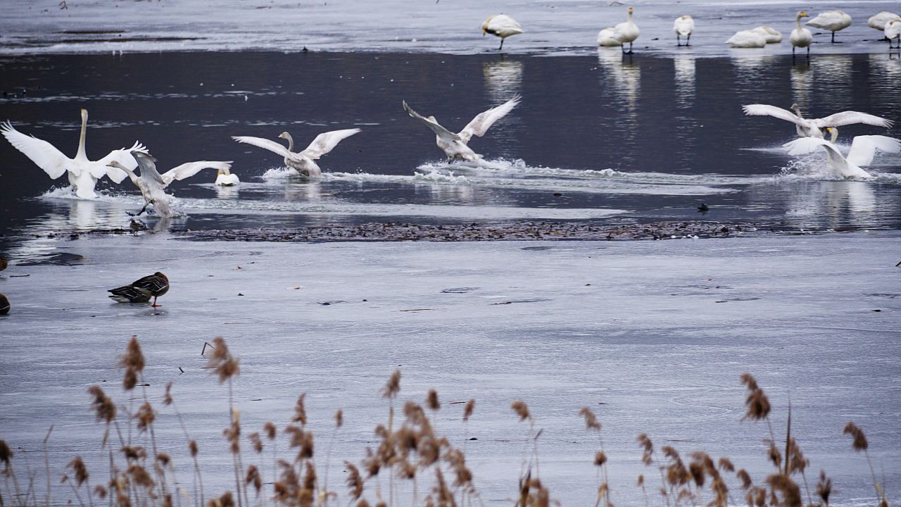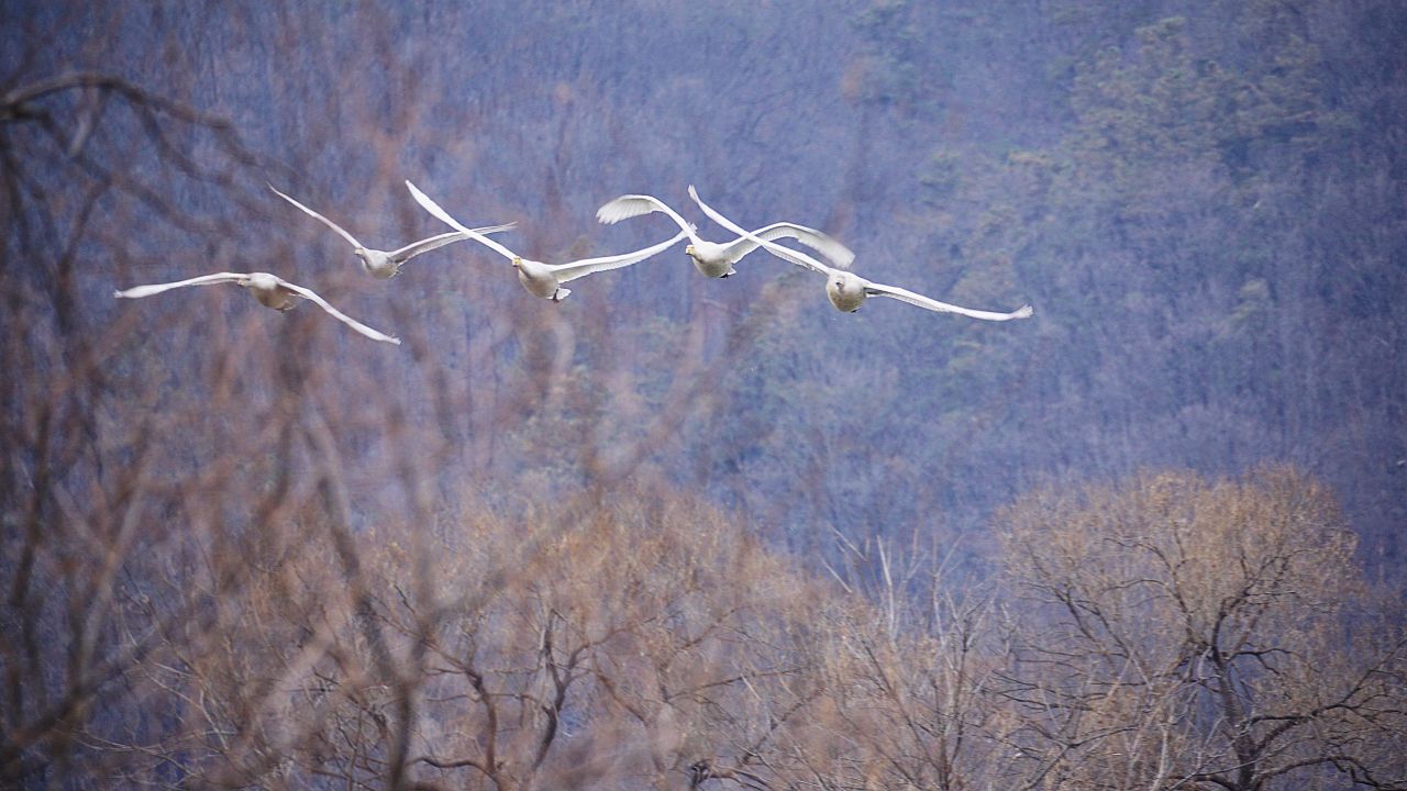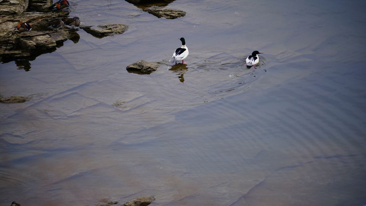 고니와 오리, 기러기들이 함께 모여 있네요.
