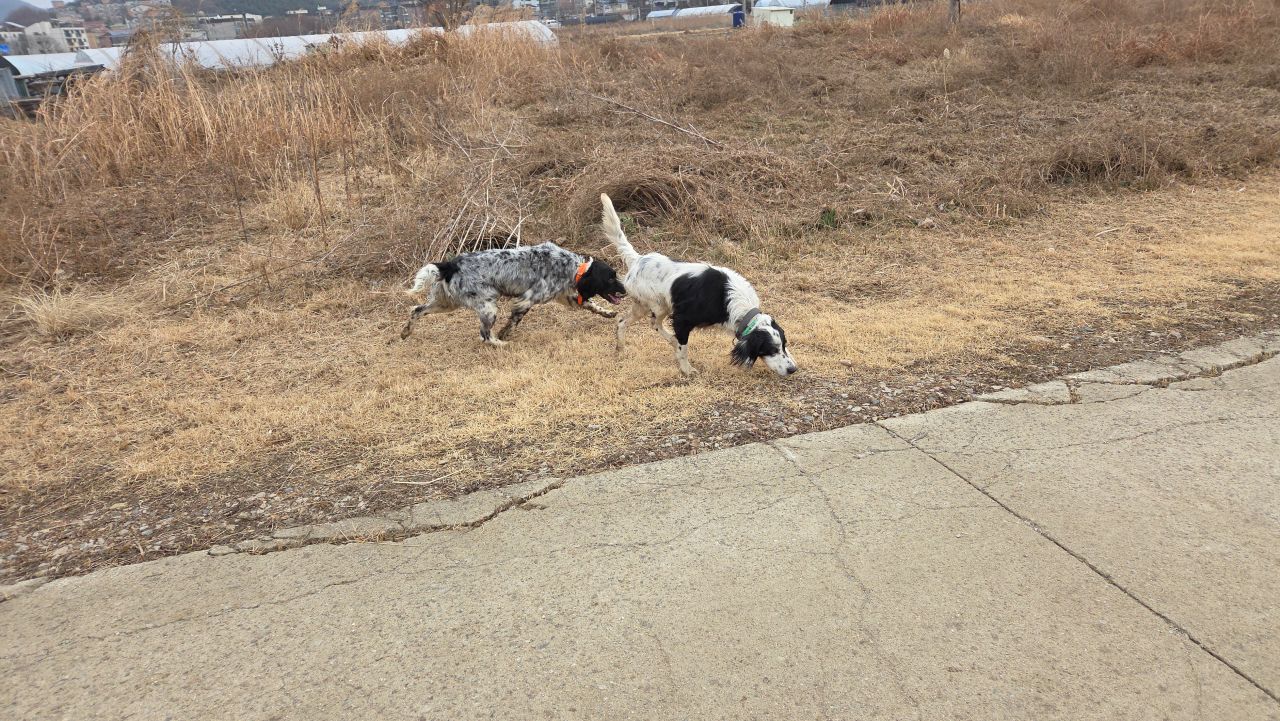 어느새 녀석 두 마리가 다가와 아는 체하네요. 목줄은 없지만 금방 순둥이라는 걸 알아보겠습니다. 뒤이어 다가온 아저씨에게 무슨 종류냐고 물어보니 꿩사냥 명견인 세터(setter)라고 일러주네요. 영역표시하는 녀석들에 바이바이 하고 돌아오는 길,