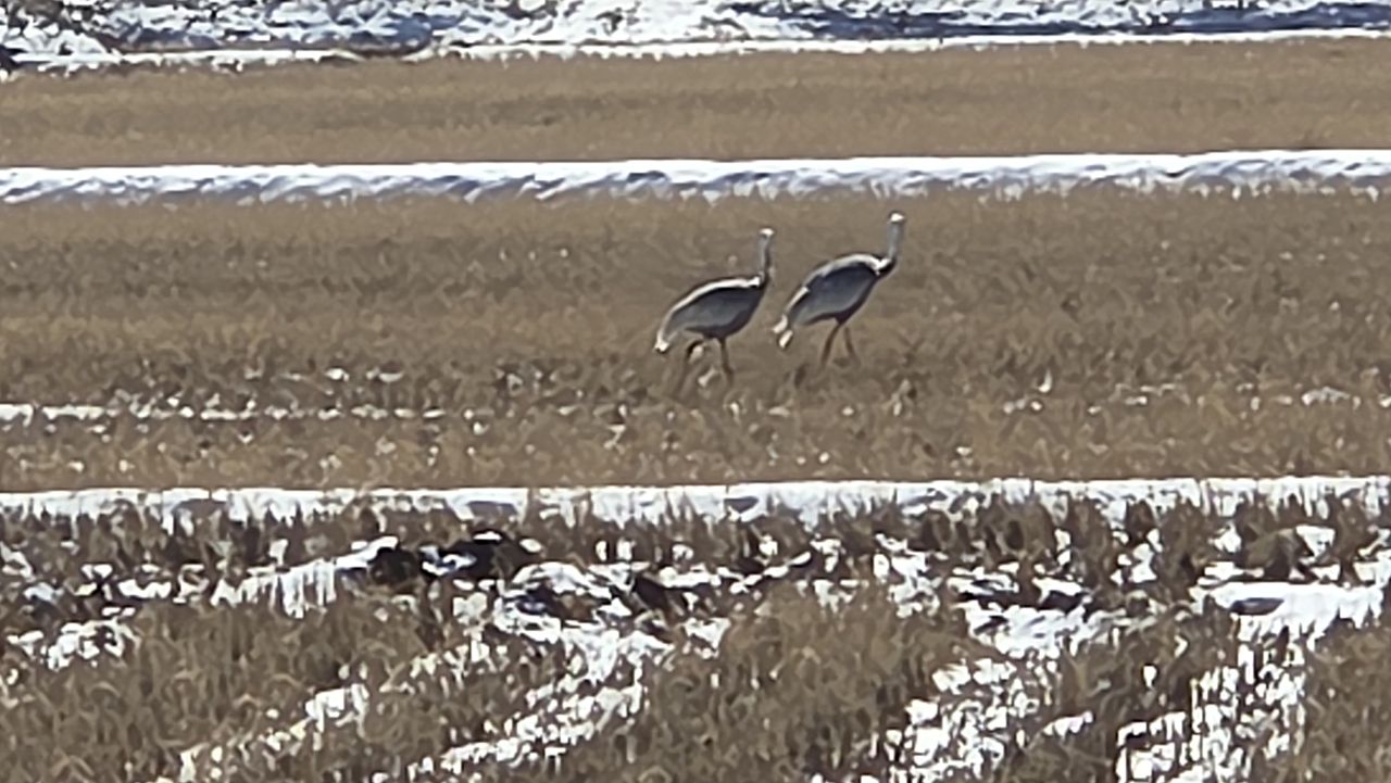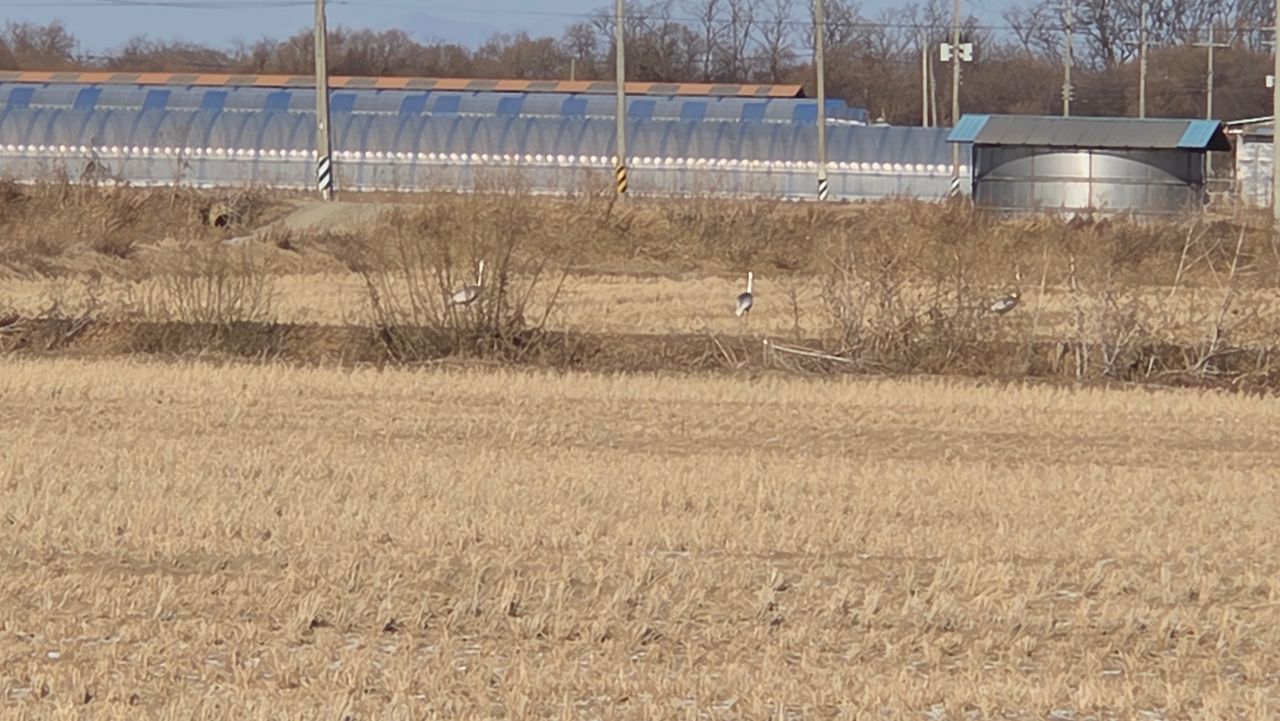 너무 멀지만 들판에 웅크리고 있는 재두루미 세(3) 마리가 보이네요.