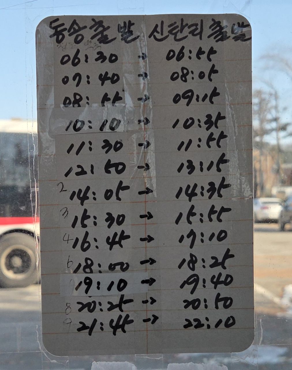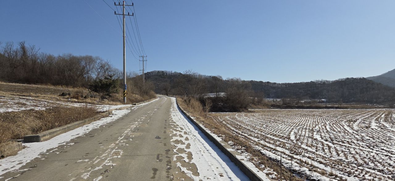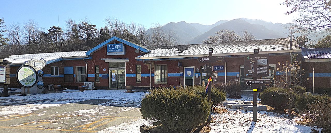 연천역에 내려 3번 출구 앞 정류장에서 3분 기다려 타고 온 39-2번 버스, 신탄리역에서 하차해 정류장 유리창에 붙은 시간표를 보니 백마고지역에 가는 유일한 버스인 13번 버스, 무려 한 시간이나 기다려야 하네요. 영하 8도까지 내려간 몹시 추운 날이어서 따끈한 커피 한잔 놓고 기다리면 좋겠다 싶어 마을길을 한 바퀴 돌아보았지만 커피숍이 안 보이네요. 닭백숙 음식점들이 몇 군데 보입니다. 다행히 정류장 부스 내에 벤치가 열선작동되어 따스하네요. 그렇게 기다려 11시 56분에 승차,