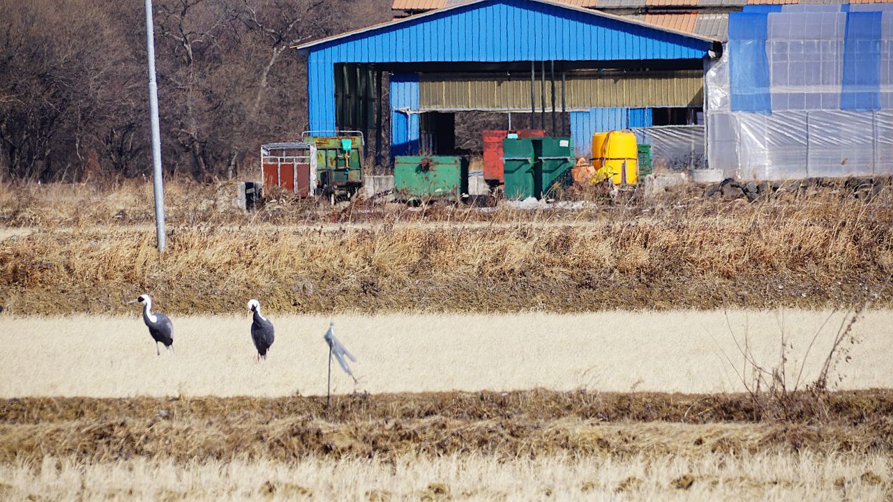 현재 민통선에 갇혀 있는 최북단 백마고지는 전쟁 중 중부전선 요충지인 철원지역의 최북단 고지였습니다. 철원읍 사요리의 드넓은 철원평야(재송평) 한가운데에 오뚝한 소이산에서 바라보이는 백마고지는 손에 잡힐 듯 가깝습니다. 지금은 전망대에 올라 풍요로운 들판을 내려다보는 평화로움이지만 전쟁 직후에 미군이 주둔하면서 레이다기지에 발칸포 포대가 설치되었던 소이산입니다. 철원평야를 지켜준 작은 산봉우리이죠. 그 소이산 가는 사요리 들판에서 한낮에도 영하 8도였던 몹시 추운 토요일 오후 재두루미와 두루미를 만났습니다. 임진강에서 잠깐 날아든 겨울의 진객입니다.