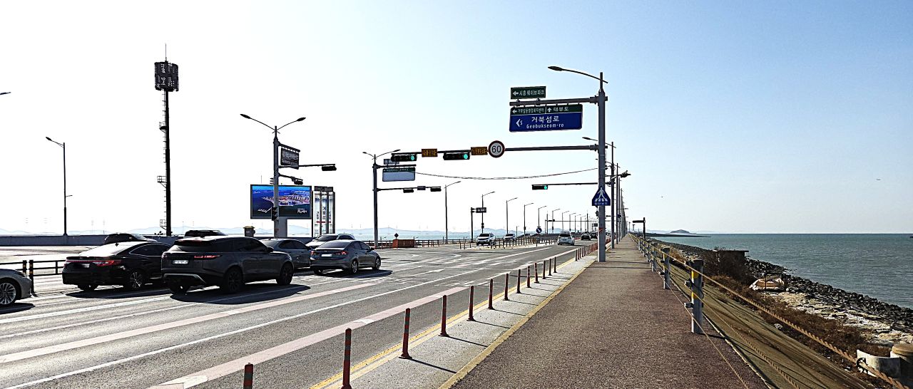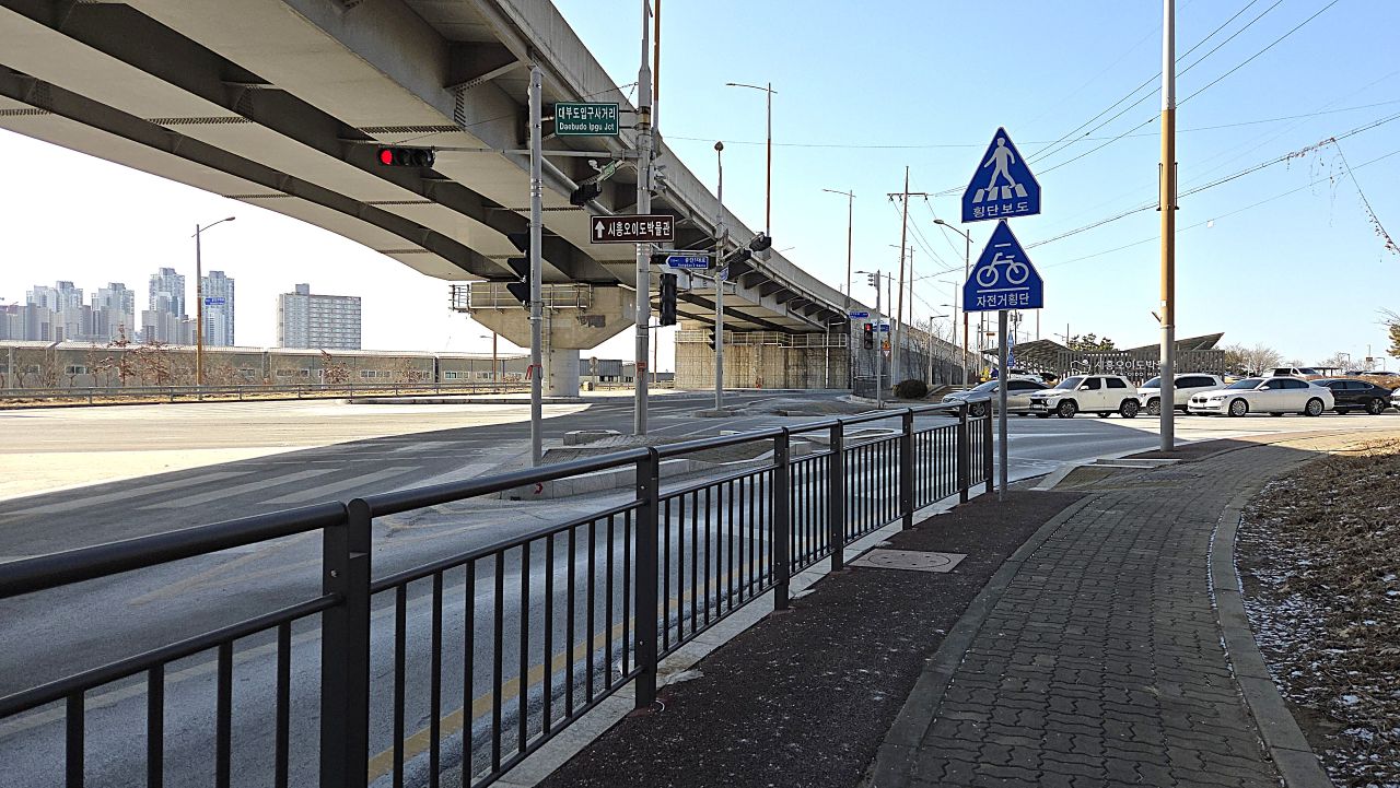 바로 앞에 박물관 안내판이 보이듯이 시화방조제길(대부황금로)로 이어지는 고가밑에서 횡단보도 건너가면 바로 박물관이죠. 하지만, 바로 이 지점에서 좌측 횡단보도 건너 직진해 갔던 늠내길 4코스인데 이따 박물관에서 나와 4코스를 일부 따라가는 게 아닐까 싶어 두리번 살펴보아도 6코스 진행 화살표는 안 보이네요. 방조제를 몇 번이고 달리고 걷기도 하였지만 방조제에서 이탈해 갈 수 있는 섬이라곤 본 기억이 없기 때문입니다. 오늘 코스의 목적지 거북섬이 어디 있는지가 우선 궁금합니다. 일단 앞에 횡단보도 건너갑니다.