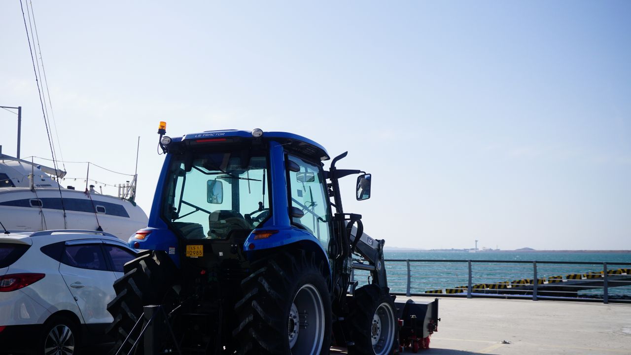 요트를 끄는 트랙터인가.., 옆에 카트도 한 대 주차되어 있습니다.