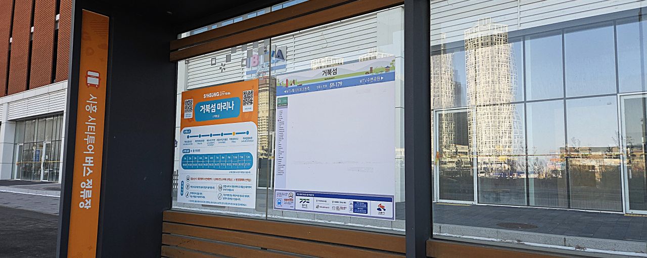 마리나에서 돌아 나와 가까운 버스정류장(거북섬)에서 33번 버스에 승차, 정왕역에서 하차,