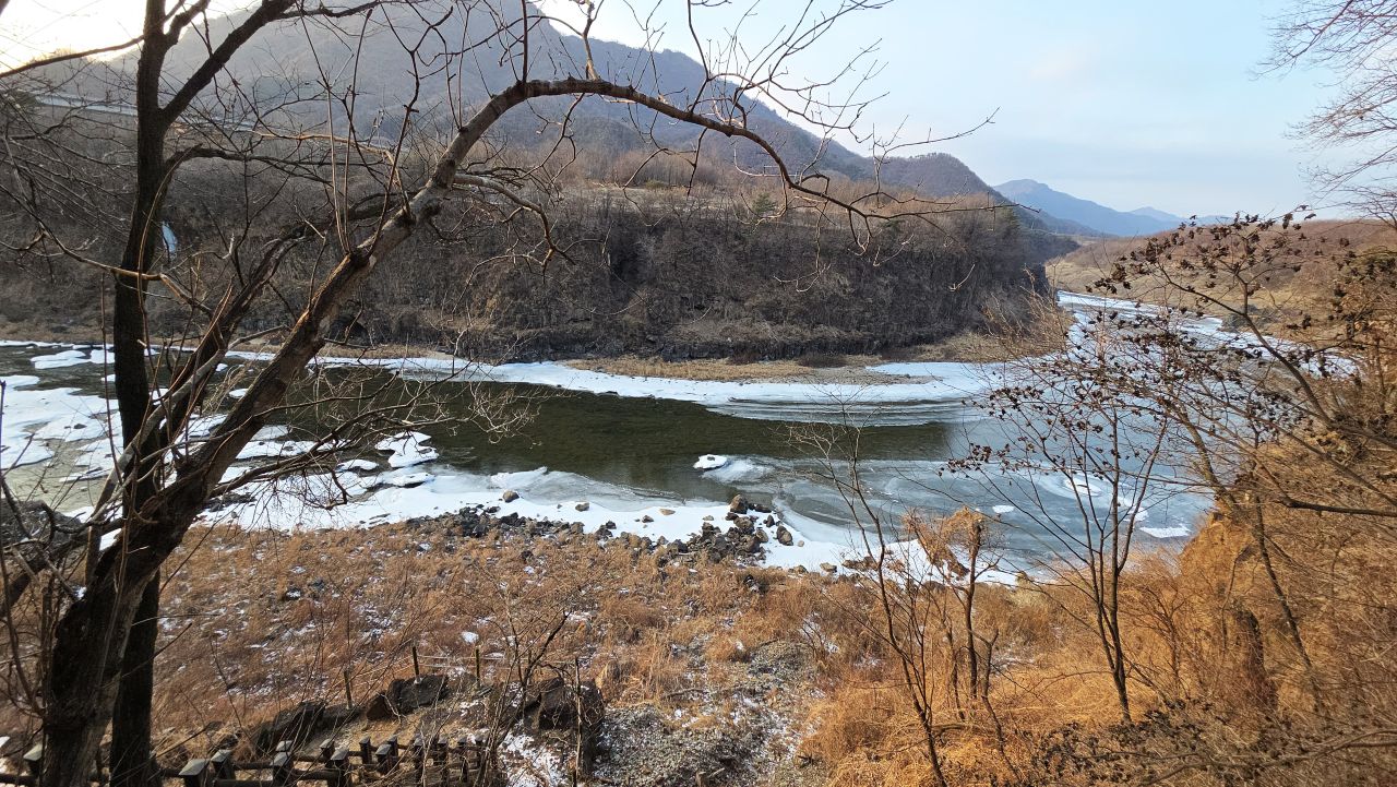나뭇가지 사이로 보이는 꽁꽁 언 한탄강